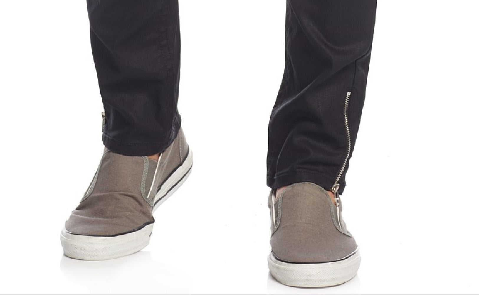 Braguilha com zíper e fecho de botão; passantes para cinto | Detalhe de bigodes e desbotamento | Painéis articulados nos joelhos e coxas; costura moto nas coxas
