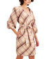 Aproximadamente 38" de comprimento | Decote em V; Silhueta envolvente | Fecho de cinco botões | Mangas 3/4 bufantes | Estampa xadrez; amarração na cintura; bolsos no quadril | Algodão/linho/outro; forro: 100% algodão