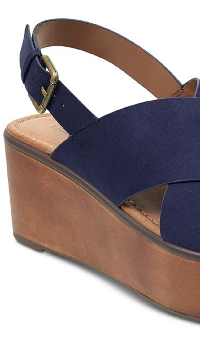 Sandálias plataforma com bico redondo e fecho de fivela | Tiras cruzadas na parte superior; tira traseira tipo sling | Cabedal sintético; sola sintética