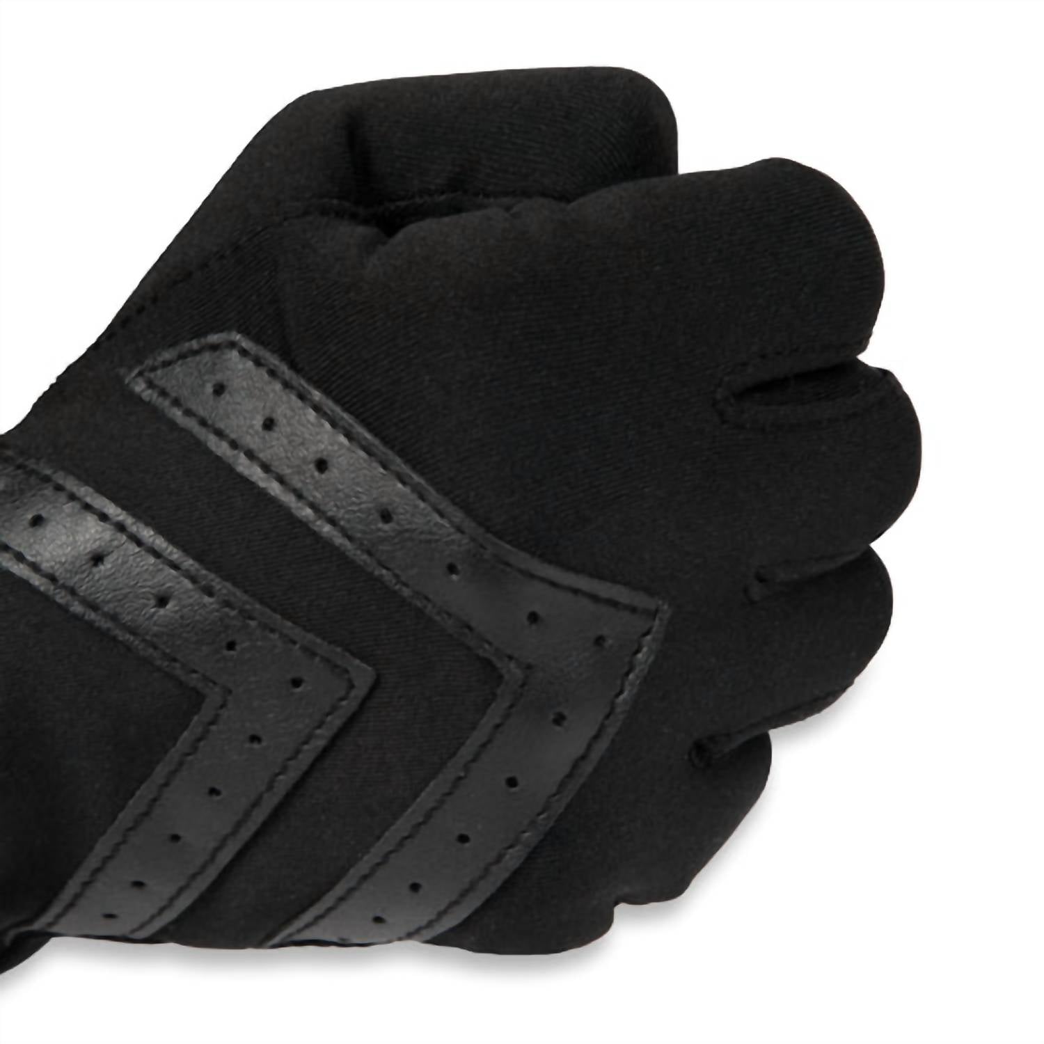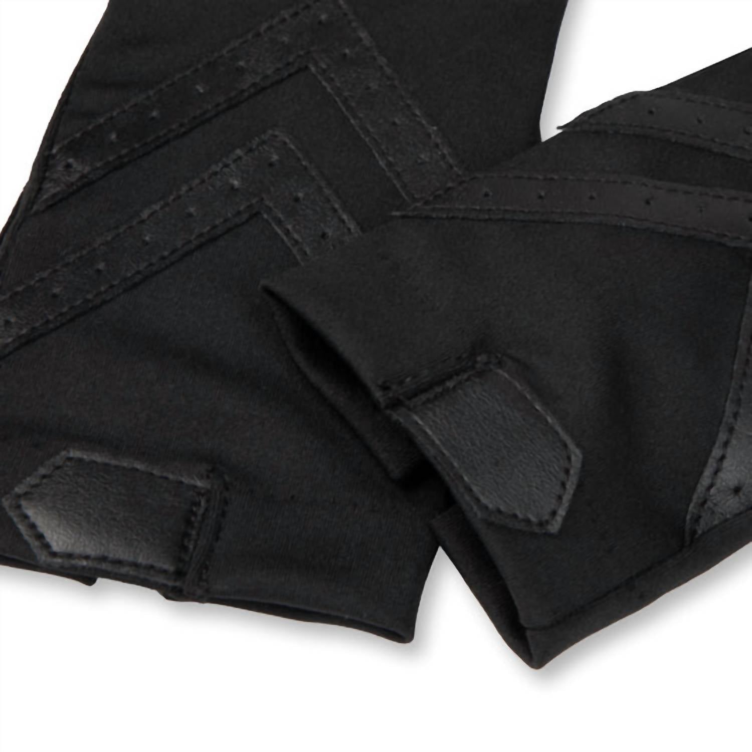 Introducing the Women's Spandex Shortie Glove With Chevron Detail by Isotoner, crafted to offer both style and functionality. These wrist-length gloves in classic black feature a 4-way stretch spandex fabric, ensuring a contoured, customized fit for superior flexibility and dexterity. Enhanced with smartDri® technology, they repel water, while smarTouch® fingertips provide excellent touchscreen capability. The design includes a palm patch for a secure grip, and these lightweight, unlined gloves are machine washable for convenient care.