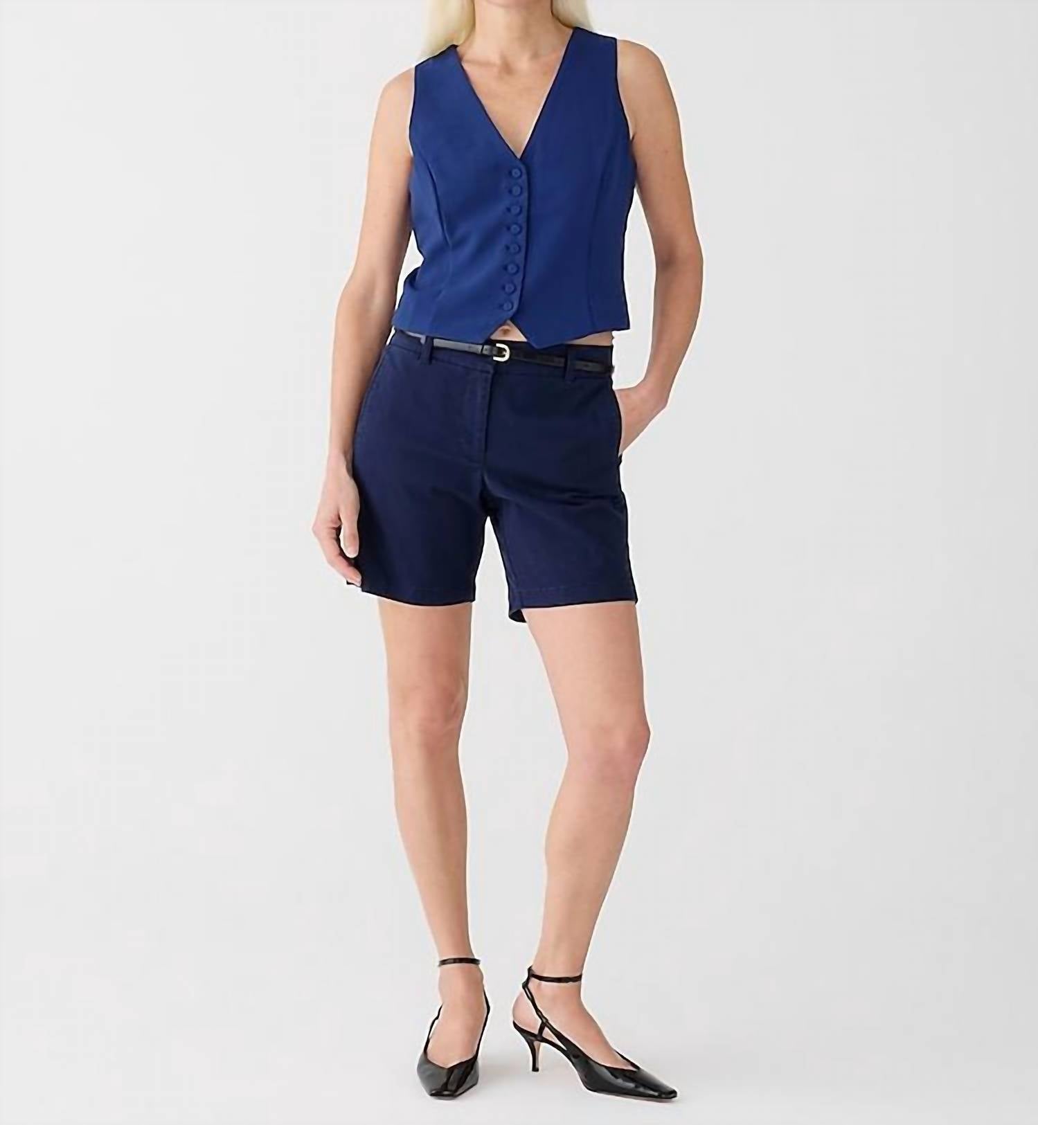 Eleve seu guarda-roupa para o clima quente com o short chino elástico de 7 polegadas da J.Crew em um tom azul-marinho clássico. Projetado para mulheres e com cintura alta, este short é confeccionado em uma confortável mistura de algodão com 97% algodão e 3% elastano, garantindo facilidade de movimento. O short apresenta uma silhueta ajustada com um padrão sólido e vem com um prático fecho de zíper. O cuidado é fácil com as instruções de lavagem à máquina e secagem em tambor, tornando-o uma escolha confiável e elegante para qualquer ocasião.