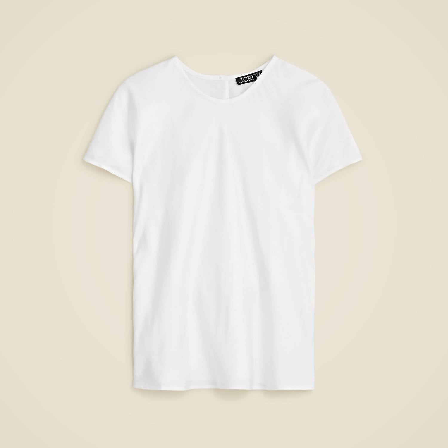 Esta camiseta clássica de manga curta será sua peça essencial nesta temporada e nas próximas. Eleve seu estilo casual com a camiseta Drapey da J.Crew na elegante cor Ivory. Esta camiseta de manga curta é confeccionada em 100% viscose para um acabamento elegante e acetinado, perfeita para usar em camadas ou sozinha. Originária da Índia, apresenta um elegante fecho de botão nas costas e gola redonda. O comprimento da peça é de 60 cm; para cuidados, lave à máquina com água fria e seque no varal.