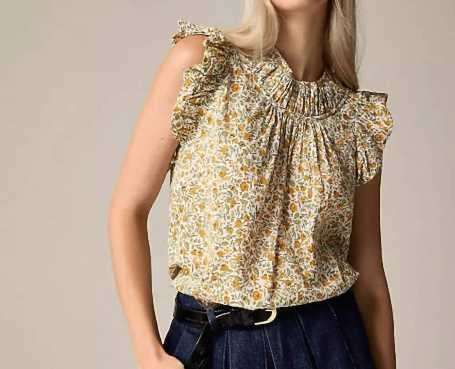 Combine isso com seus jeans e chinelos favoritos para sua próxima noite entre amigas. Apresentamos a Blusa com Mangas Babadas e Franzidas em Voile de Algodão Floral Vines da J.Crew, uma blusa deslumbrante sem mangas que esbanja sofisticação. Confeccionada em uma mistura de algodão com 55% algodão e 45% viscose, esta blusa apresenta uma charmosa gola alta franzida e mangas com babados, perfeita para a transição de estação. Fabricada na Índia, tem 56 cm de comprimento e apresenta uma vibrante estampa floral na cor Branco Multicolorido. Cuide desta peça requintada seguindo as instruções de lavagem à máquina e secagem em secadora para mantê-la com aparência de nova.