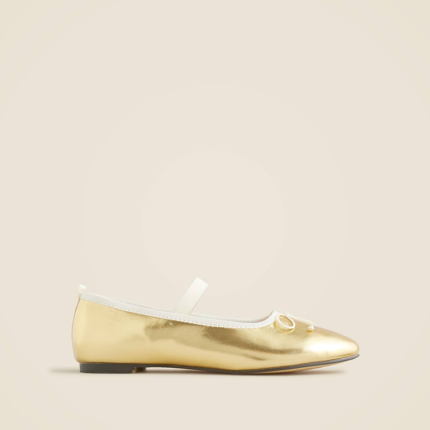 Eleve o seu estilo com as sapatilhas de balé com tiras para meninas da J.Crew, uma mistura perfeita de elegância e conforto em um dourado cintilante. Confeccionadas com cabedal de poliuretano durável e solado de borracha, estas sapatilhas têm bico redondo e salto baixo de menos de 2,5 cm, garantindo conforto o dia todo. Ideais para ocasiões mais formais ou para o dia a dia, elas dão um toque chique a qualquer look. As instruções de cuidado recomendam uma limpeza localizada para manter a aparência impecável.