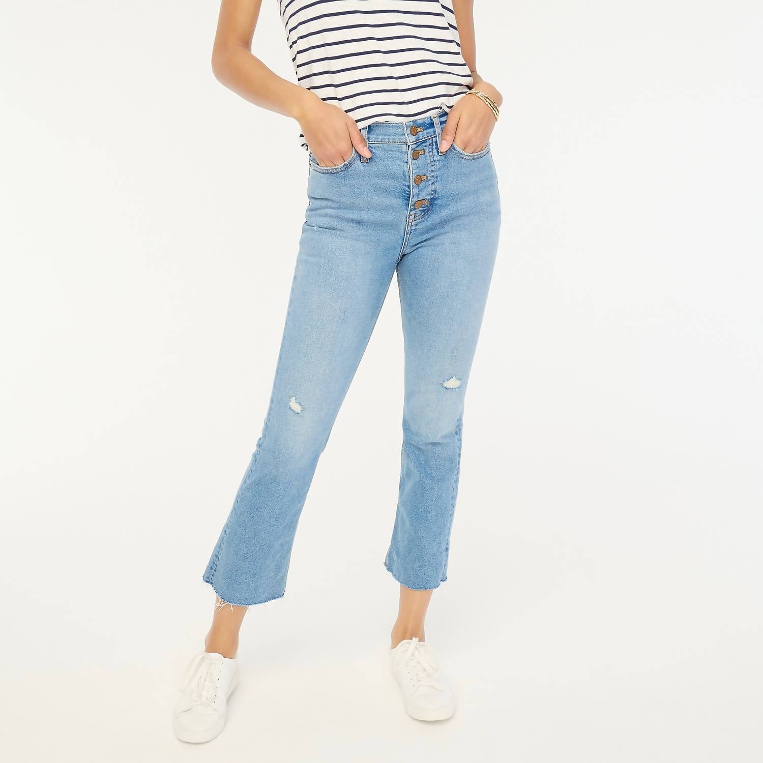 Coloque sua camiseta favorita dentro deste jeans de cintura alta para uma sensação mais casual e descolada. Descubra a calça jeans flare cropped de cintura alta da J.Crew, habilmente confeccionada para quem aprecia versatilidade e estilo. Com uma composição confortável de 92% algodão, 7% algodão reciclado e 1% elastano, esta calça jeans oferece elasticidade para o dia todo, com elasticidade mínima, para fácil uso. Com fecho de botão e estilo tradicional de 5 bolsos, esta calça jeans fica acima da cintura com um corte slim no quadril e na coxa, terminando em uma elegante perna cropped flare com uma costura interna clássica de 66 cm. Originária do Camboja, os cuidados são mantidos com instruções de lavagem à máquina e secagem em tambor.