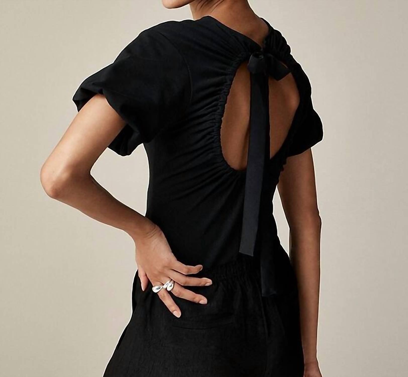 Combine isso com seus jeans e chinelos favoritos para sua próxima noite entre amigas. Conheça a blusa J.Crew com mangas bufantes e costas abertas, uma mistura charmosa de conforto e moda. Esta blusa preta tem mangas curtas e gola careca, todas confeccionadas em uma mistura de algodão com elastano para maior mobilidade. Com um detalhe diferenciado de amarração em fita nas costas abertas, ela tem um toque elegante e mede 57 cm de comprimento. Fabricada na Índia, é fácil de cuidar, podendo ser lavada na máquina e seca na secadora.