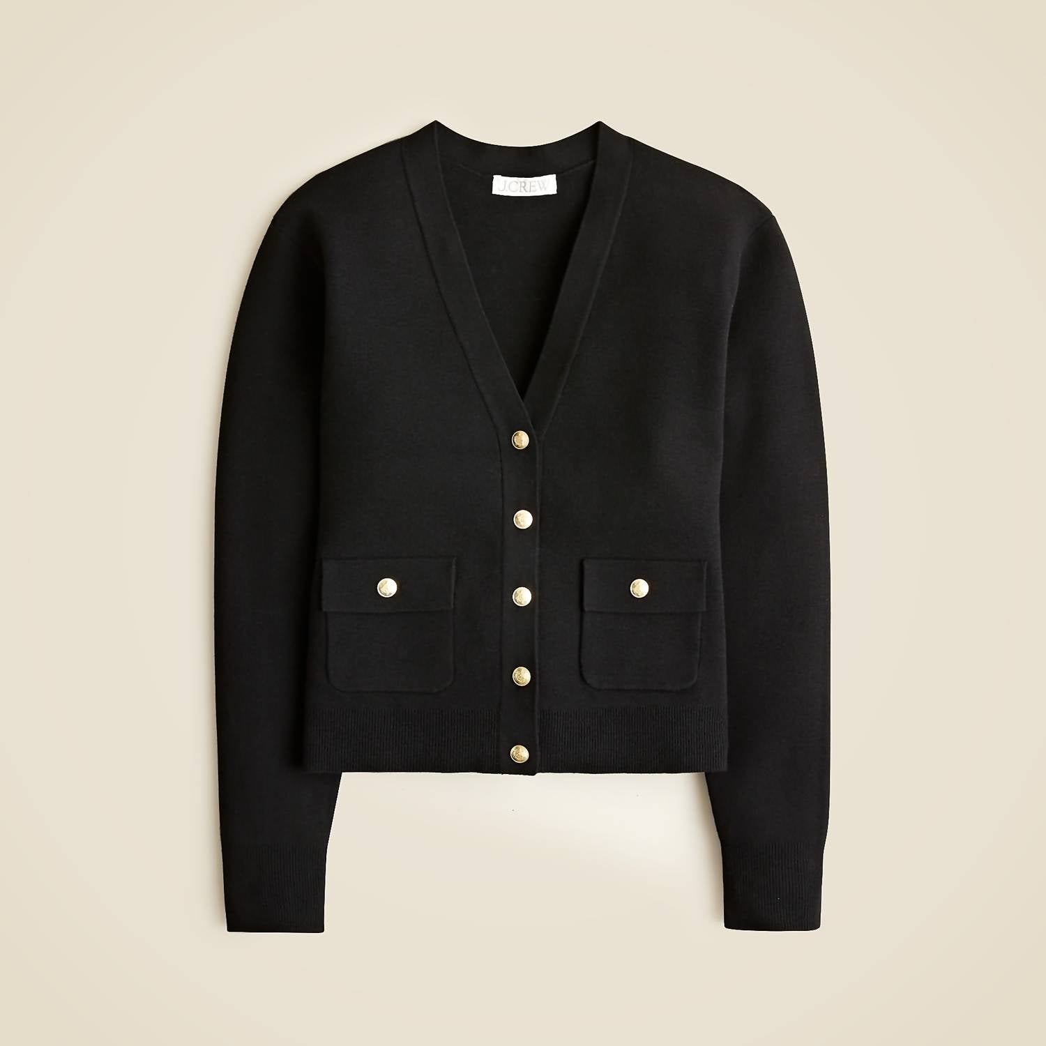 Introducing the Patch-pocket Cardigan Sweater by J.Crew, a sophisticated choice in solid black. This V-neck cardigan features long sleeves and heritage-inspired patch pockets, adorned with signature gold crest buttons. Composition: 58% viscose, 22% polyester, 17% polyamide, 3% elastane; length: 20.5 inches; a perfect hip-hitting length. Originating from Cambodia, this piece requires dry cleaning, ensuring its fine-knit fabric remains pristine.