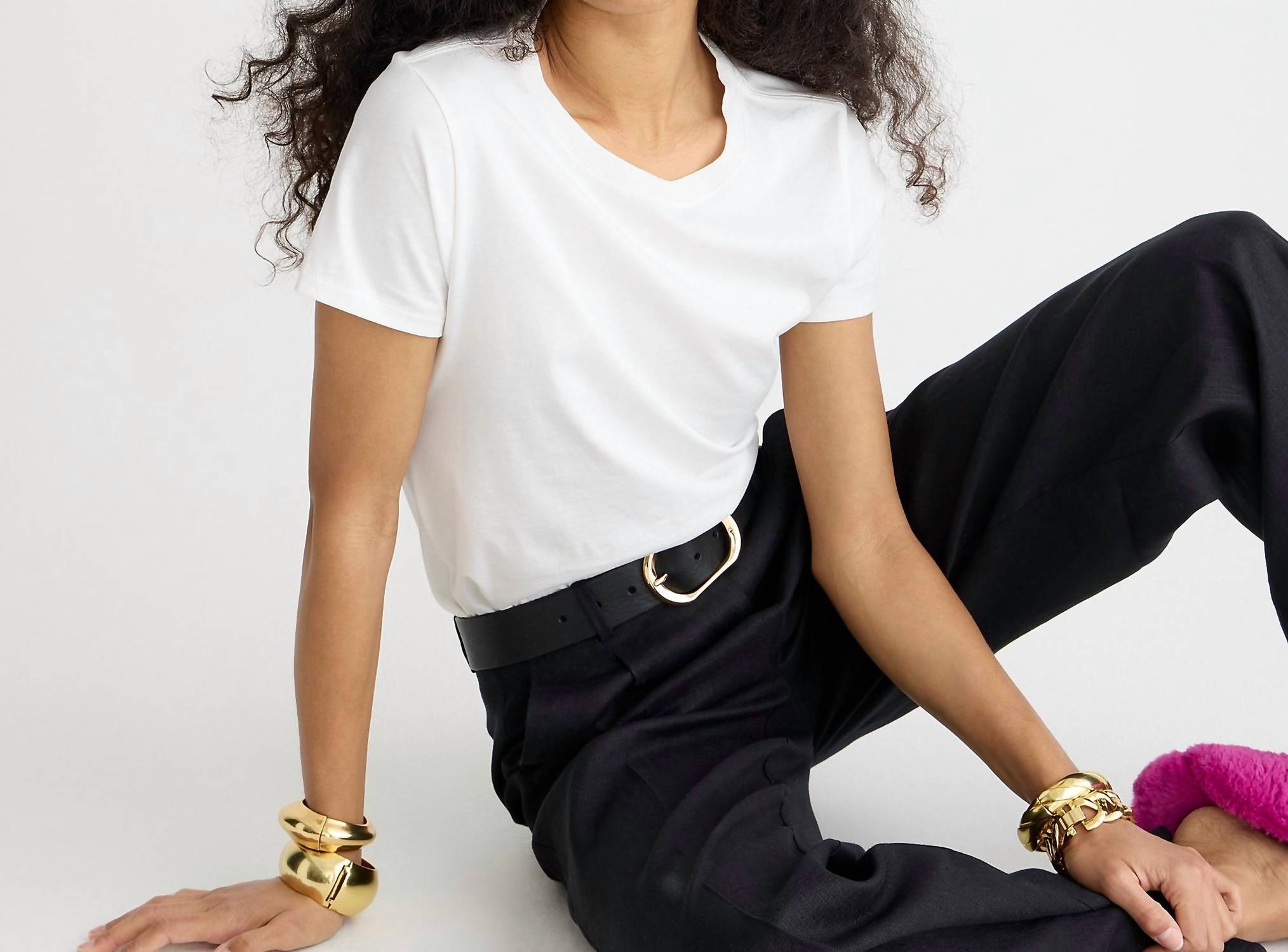 Não procure mais, você acabou de encontrar a camiseta perfeita! Experimente o máximo conforto com a camiseta slim fit J.Crew Pima Cotton, confeccionada em algodão peruano premium para um toque ultramacio e quase sedoso. Esta camiseta feminina apresenta gola redonda clássica e mangas curtas, proporcionando um caimento mais justo e confortável para o dia a dia. Composição: 100% algodão. Comprimento da peça: 23". País de origem: Peru. Fecho: estilo pull-on. Cuidados: Lavar à máquina e secar na secadora.