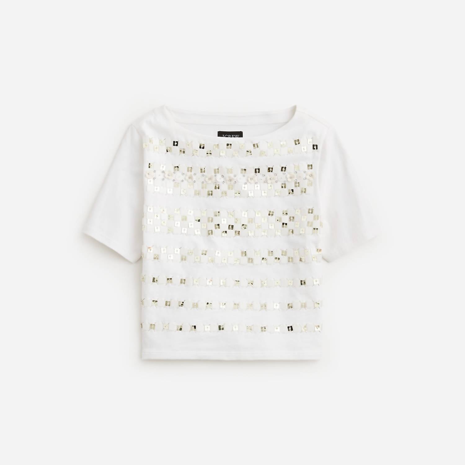 Esta camiseta clássica de manga curta será sua peça essencial nesta temporada e nas próximas. Descubra a Camiseta Feminina Embellished da J.Crew, uma peça deslumbrante em branco que eleva qualquer guarda-roupa. Com mangas curtas e acabamento texturizado com detalhes que refletem a luz, pequenos apliques florais e pérolas artificiais, esta camiseta de algodão é uma escolha luxuosa. Feita na Índia, oferece um fecho prático e mede 60 cm de comprimento. Para facilitar os cuidados, basta lavar na máquina e secar na secadora.
