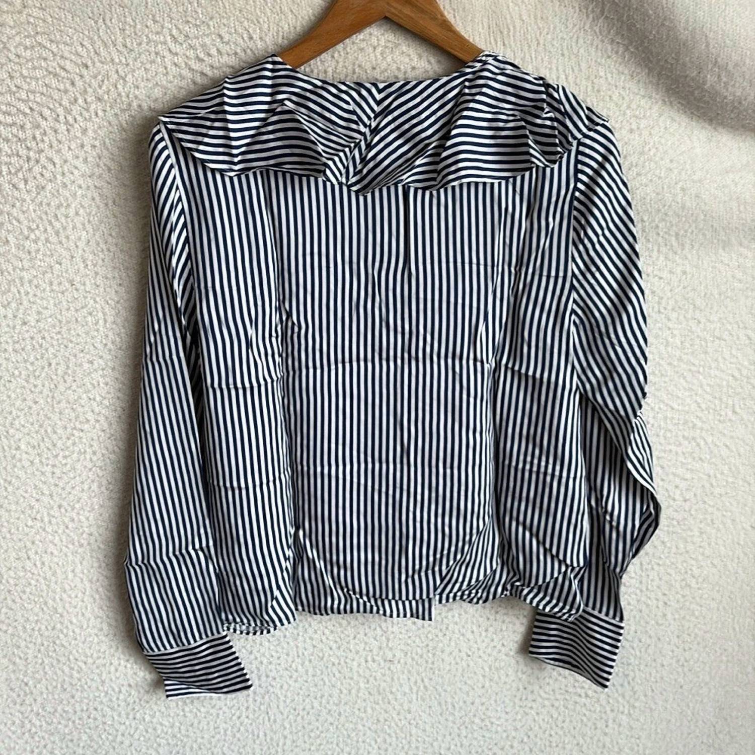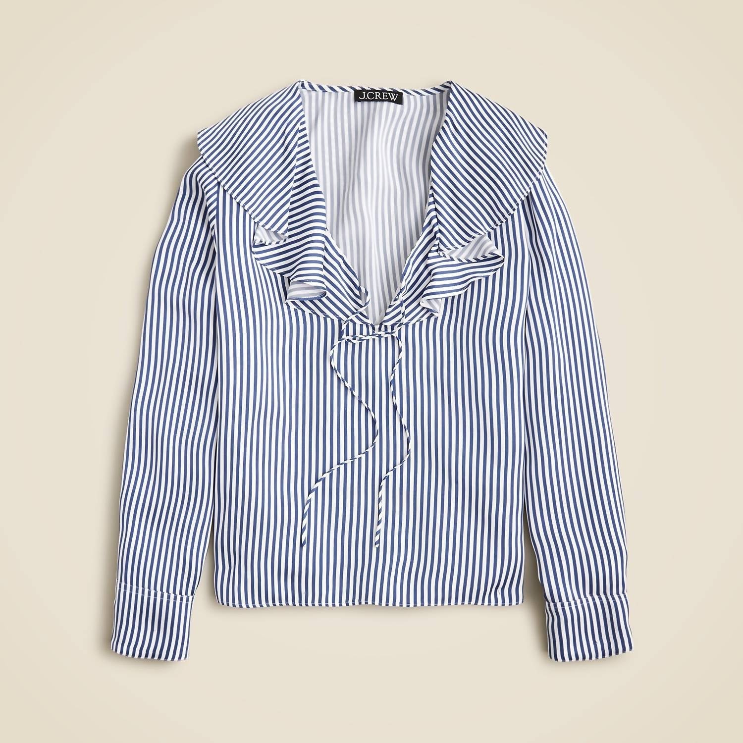 Eleve seu guarda-roupa com a blusa feminina Goldie da J.Crew em cetim listrado, com elegantes mangas compridas e um elegante decote em V. Confeccionada em 100% viscose, esta blusa oferece um luxuoso acabamento acetinado e uma estampa atemporal de listras azuis e brancas. Com 60 cm de comprimento, a blusa é de vestir e vem da Índia. Para facilitar a manutenção, lave na máquina com água fria e seque no varal.