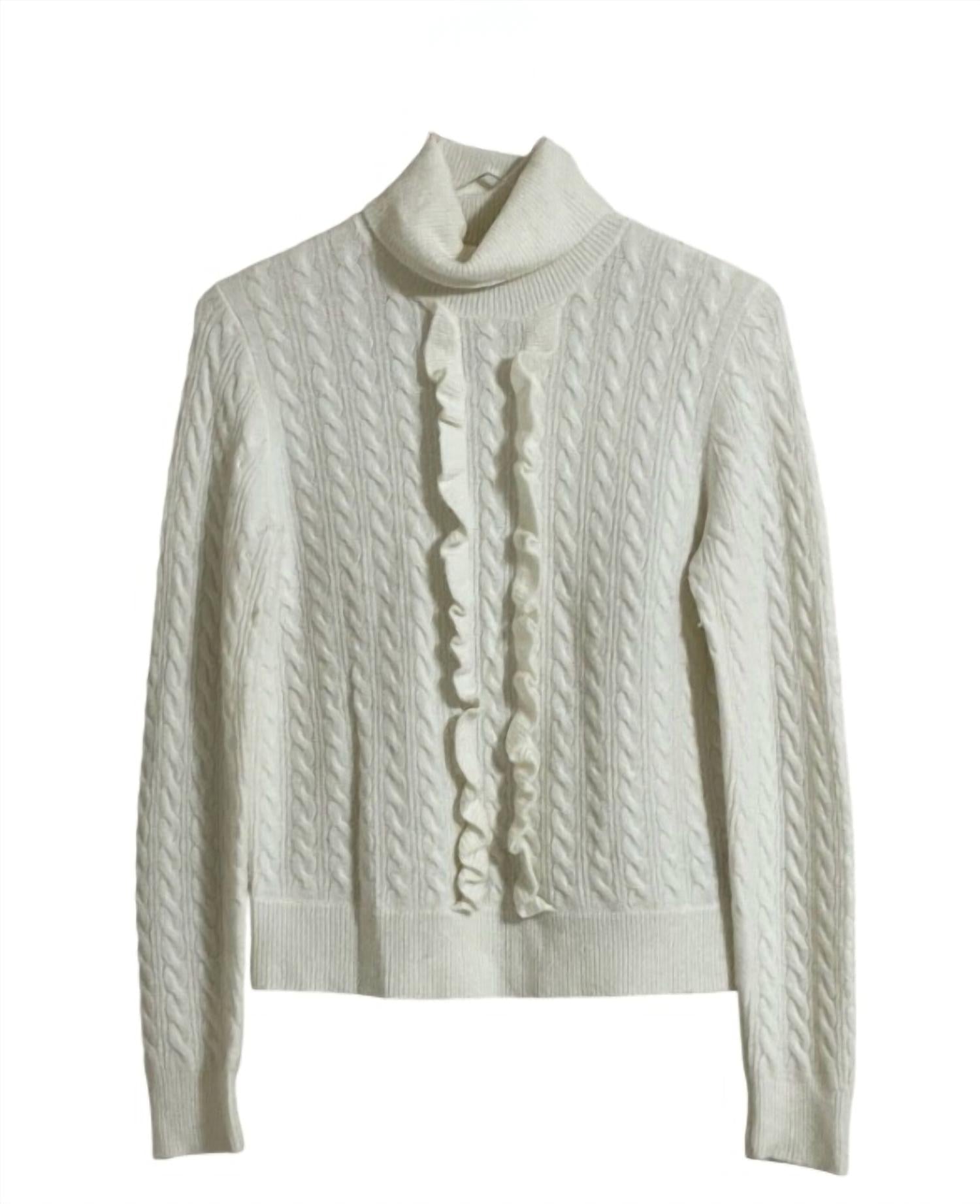 Ajuste perfeito e chique sem esforço. O suéter feminino de gola alta em lã mista com babados frontais supermacios da J.Crew na cor marfim é uma adição luxuosa ao seu guarda-roupa. Confeccionado com uma mistura mágica de 56% náilon, 30% lã, 10% alpaca e 4% elastano, este suéter de manga comprida promete maciez incomparável. Com 55 cm de comprimento e detalhes clássicos em tricô trançado, ele é elegantemente realçado por babados inspirados em smokings para um toque de sofisticação. Com dimensões de 38 cm de ombro, 45 cm de busto e 63 cm de mangas, seus punhos e bainha canelados garantem um ajuste confortável. Instruções fáceis de cuidado incluem lavagem à mão e secagem na horizontal.