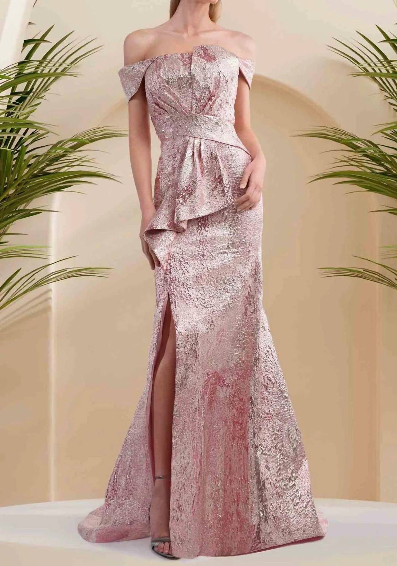Introducing the Drop Off Shoulder Mermaid Gown by Janique, a stunning piece in a romantic rose pink, perfect for making a statement at any prom or holiday party. This strapless gown features an off-the-shoulder neckline and a textured mermaid silhouette that flatters the figure. Crafted from 100% polyester, it ensures a blend of elegance and comfort with a zip closure for a seamless fit. Care instructions recommend spot or wipe clean only for maintaining its luxurious appearance.