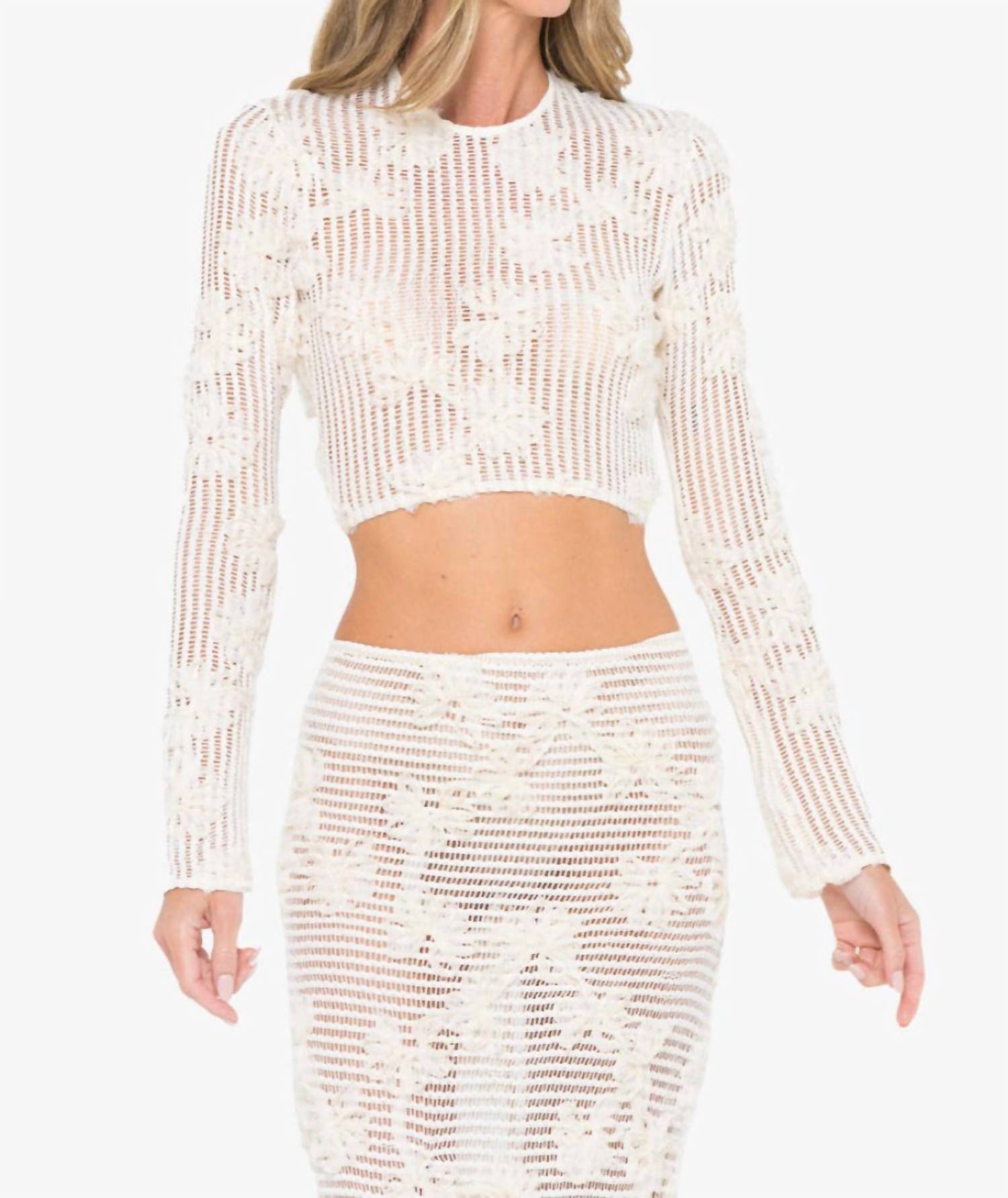 The perfect crop top for those warmer weather days. Introducing the Agustina Top by JBQ, a chic and versatile addition to any wardrobe. This ivory crop top features a fitted silhouette with long sleeves and a textured pattern. It's expertly crafted from 100% polyester and made in the USA from imported materials. The pull-on closure ensures an easy fit, and it is ideal for holiday parties with its boho-chic flair. Care instructions suggest hand washing only.