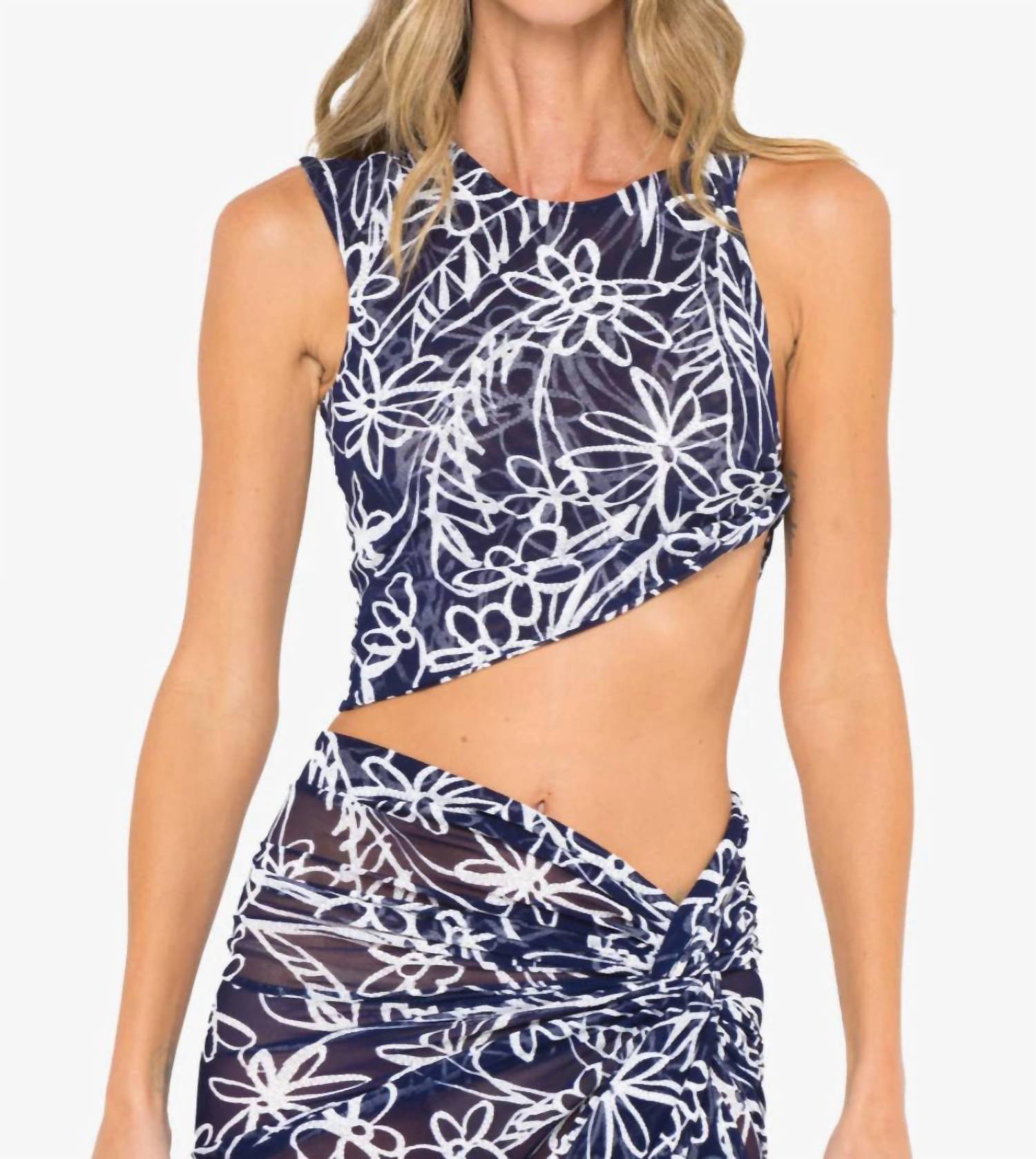 Elevate your summer wardrobe with the Araminta Top by JBQ, a chic bandeau design perfect for holiday parties. This sleeveless crop top features a vibrant navy and off-white floral pattern with a crewneck style for a flattering fit. Crafted from 96% polyester and 4% spandex, it offers a true-to-size fit ensuring both comfort and style. Easy to wear with a pull-on closure, it’s machine washable for effortless care.