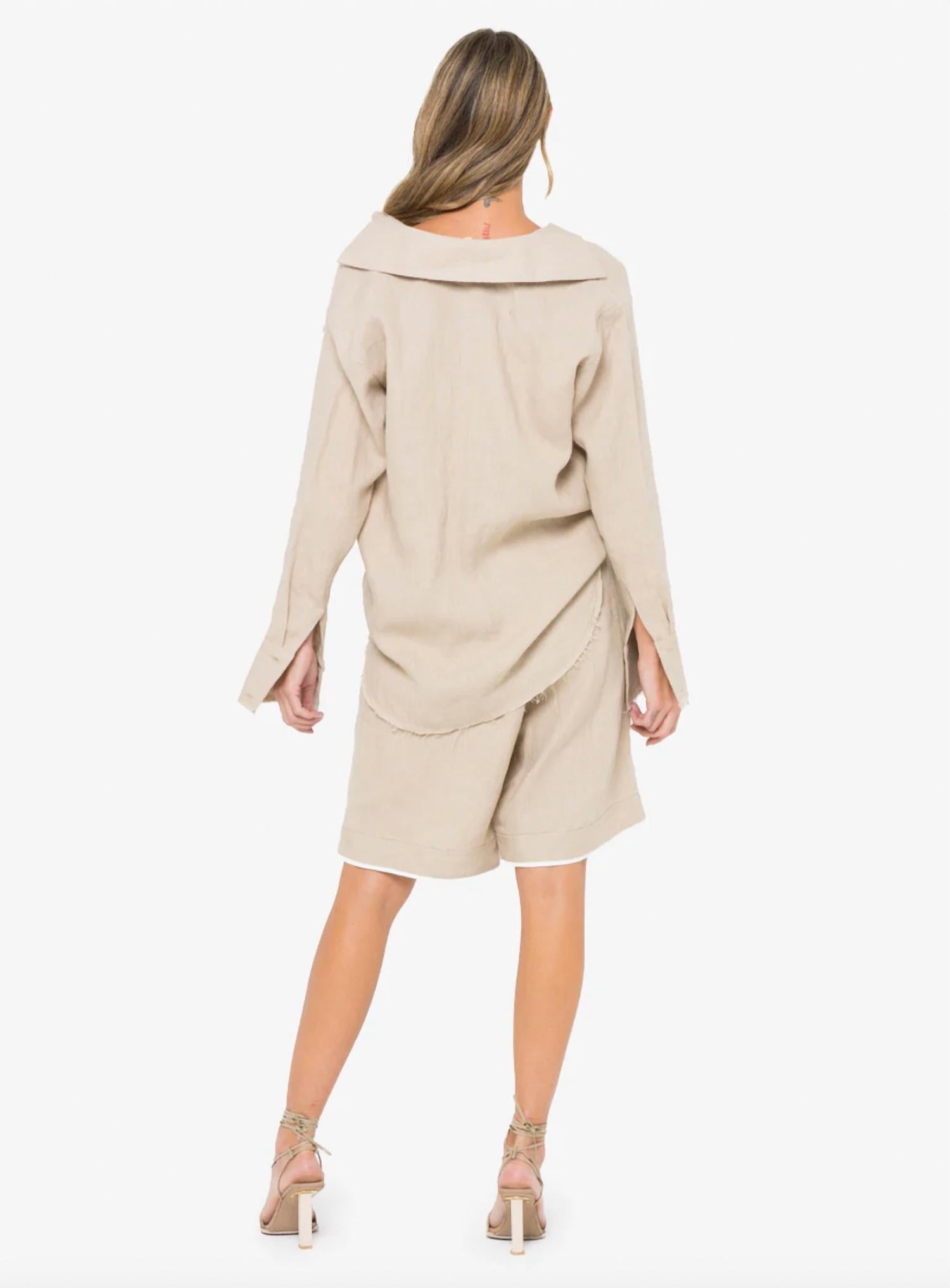 Discover the Beckett Button Down Shirt by JBQ, an elegant addition to your wardrobe in sophisticated Indigo Shibori. This women's shirt features long sleeves and a classic collar, accentuated by wide banded cuffs and raw edge hem details. Crafted from 100% polyester, it is made in the USA from imported materials with a relaxed fit. Closure: Button closure. Care: Hand wash and line dry for best results. Pattern: Polka dot.
