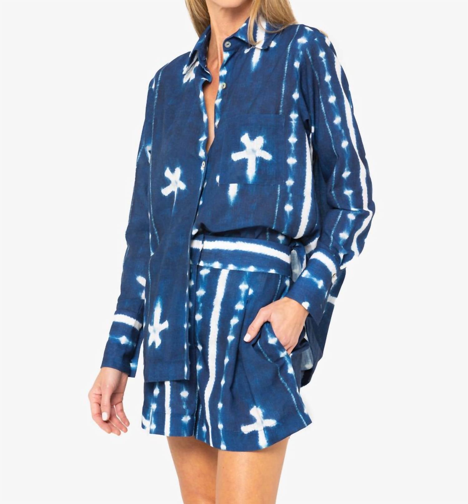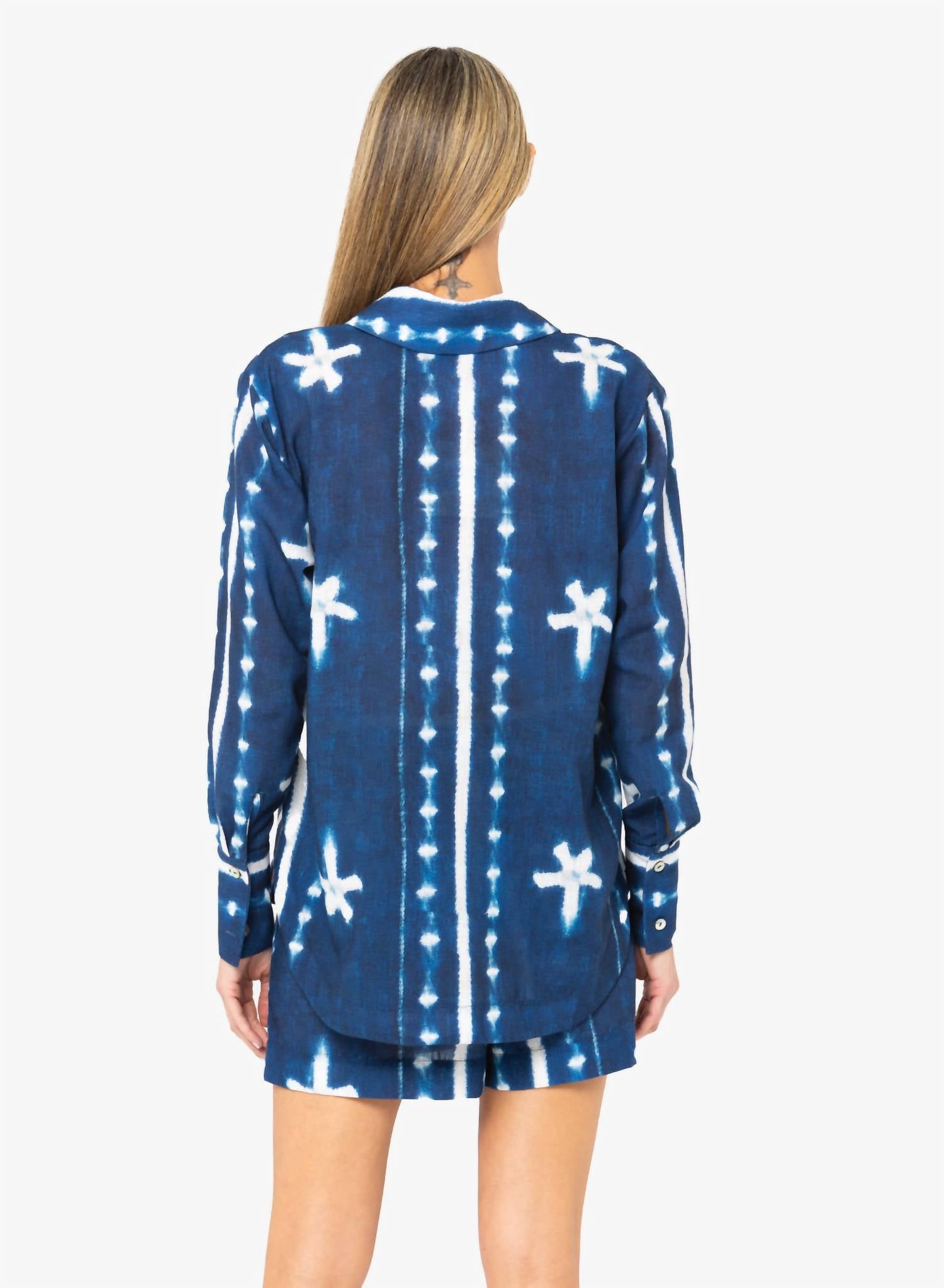 This button down shirt is comfortable yet polished. Discover the Beckett Button Down Shirt by JBQ, an elegant addition to your wardrobe in sophisticated Indigo Shibori. This women's shirt features long sleeves and a classic collar, accentuated by wide banded cuffs and raw edge hem details. Crafted from 100% polyester, it is made in the USA from imported materials with a relaxed fit. Closure: Button closure. Care: Hand wash and line dry for best results. Pattern: Polka dot.