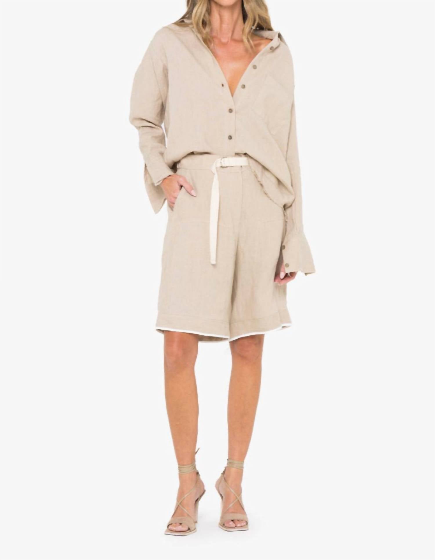 High-waist is here to stay and we especially love this style short. Introducing the Marley High Waist Shorts by JBQ, the perfect addition to your summer streetwear collection. These relaxed-fit bermuda length shorts are crafted from 100% linen and feature an adjustable D-ring belt with contrast trim accents for added style. Made in the USA of imported materials, they include practical pockets and a convenient button closure. Care instructions recommend washing cold and line drying for best results. Model is 5'9" and wearing a size small.