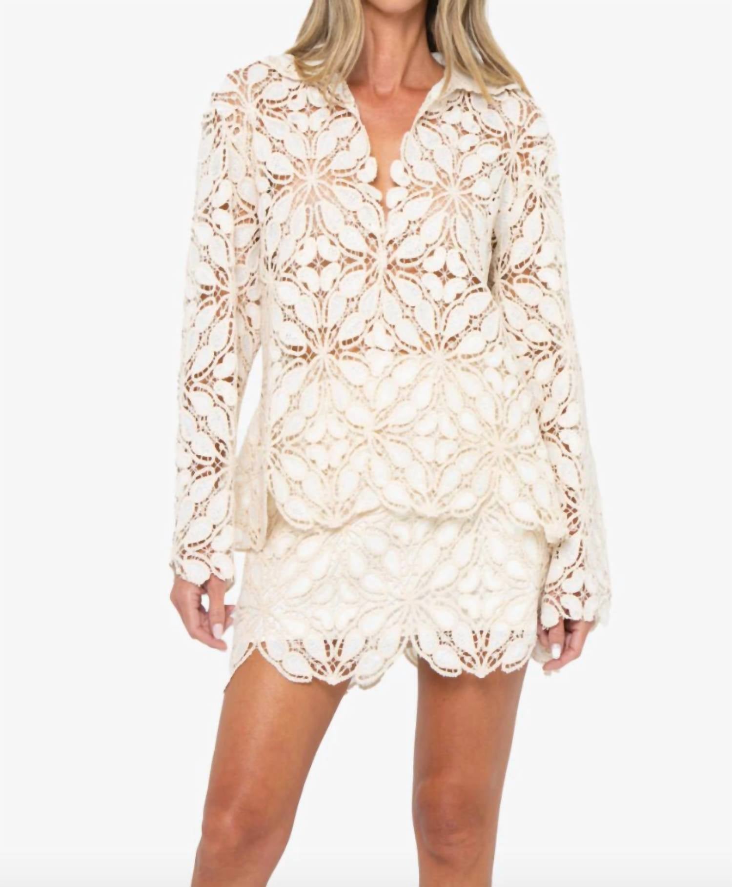 This button down shirt is comfortable yet polished. Embrace sophistication with the Maxine Long Sleeve Button Down Shirt by JBQ, perfect for a workwear chic look. This women's blouse features a collared V-neckline and a solid crochet body, offering a unique texture in a natural beige hue. It is crafted from 100% cotton, ensuring a soft and breathable fit that stays true to size. Closure: Button closure. Care: Machine wash, line dry. Ideal for spring occasions like Easter or a holiday party.