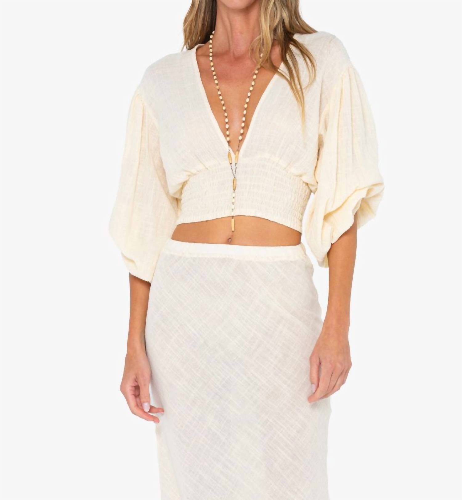 Elevate your wardrobe with the JBQ Nava Top in a rich Forest hue, embodying the Boho Chic trend. This cropped blouse features a relaxed short balloon sleeve and a V-neckline, styled with dropped shoulders and elastic cuffs for added comfort. Made from 100% cotton and crafted in the USA of imported materials, it offers a wide shirring waistband for a flattering silhouette. The pull-on closure simplifies dressing, and it's easy to care for with machine wash on a cold, gentle cycle and line dry instructions. Model is 5'9" and wears a size small.