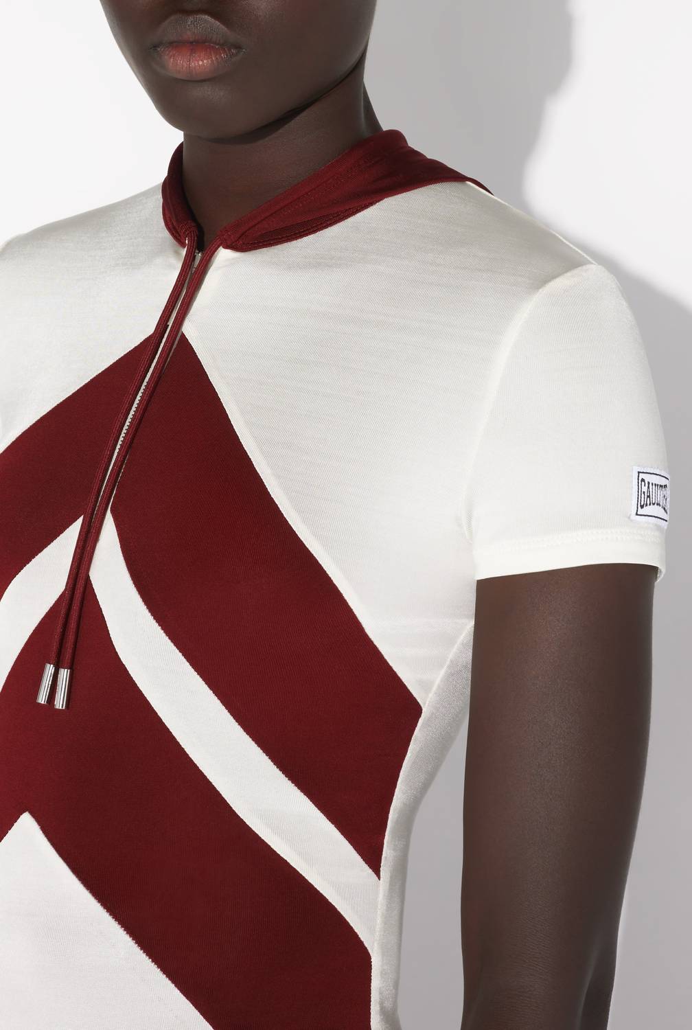 Meet the Viscose Baby Tee Shirt With Patch Detail And Hood by Jean Paul Gaultier, an ultra-chic addition to your spring wardrobe. This fitted hooded tee features short sleeves and a striking burgundy chevron pattern on a pristine white viscose blend. Made from 95% viscose and 5% elastane, it is crafted in France, ensuring high-quality workmanship. Designed with an invisible zip fastening and drawstring tabs engraved with the signature Jean Paul Gaultier, this tee is both fashionable and functional.