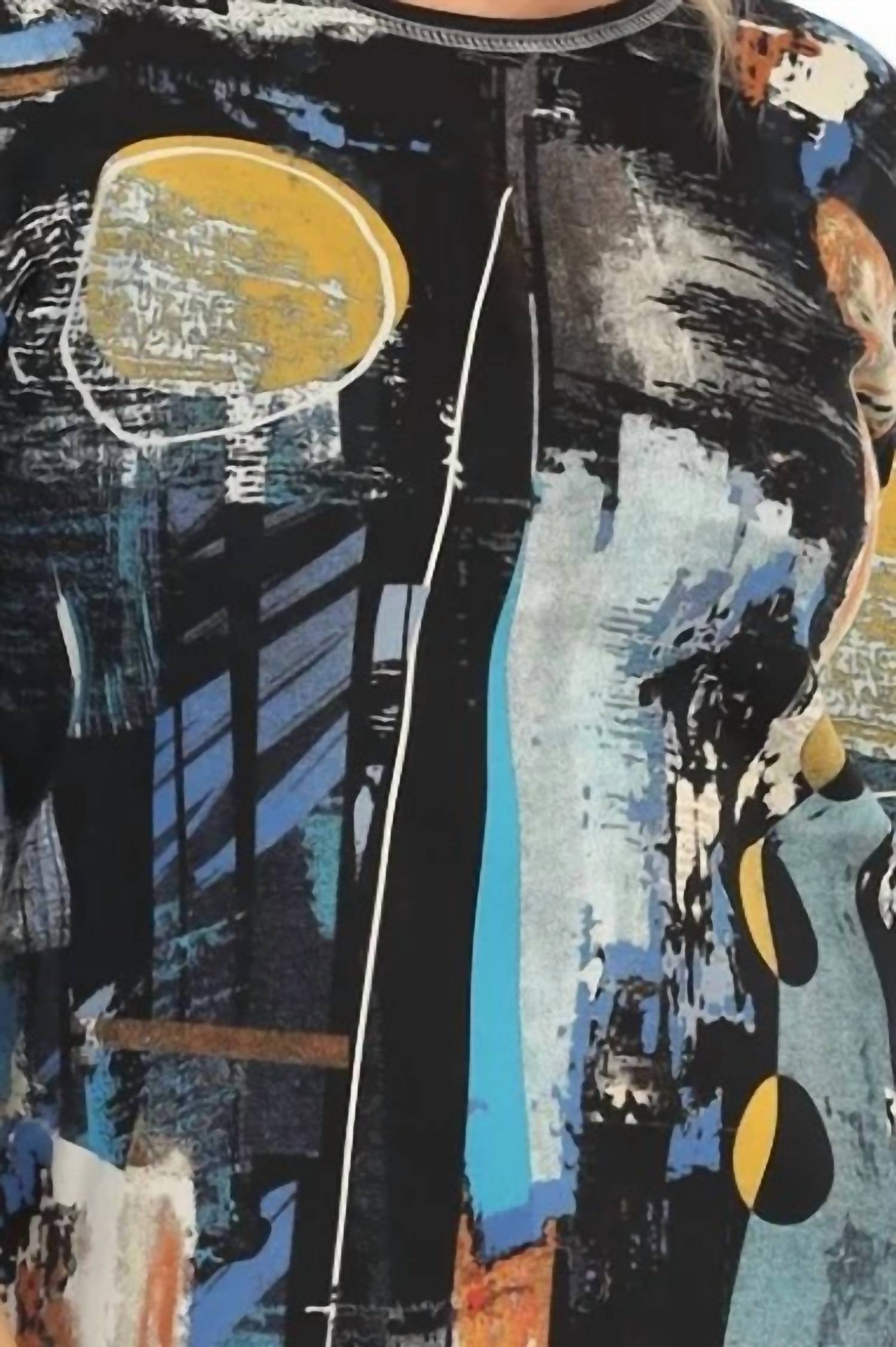 Uma blusa versátil que pode ser usada do escritório ao jantar! Apresentamos a blusa de algodão estampada Jess & Jane Denali, perfeita para dar um toque de estilo ao seu guarda-roupa do dia a dia. Esta blusa leve e estampada possui mangas três quartos, decote em V e bainha reta para um caimento relaxado. Confeccionada em 100% algodão babyrib de ótima qualidade, ela garante conforto e estilo, com um design multicolorido com fundo preto. Orgulhosamente fabricada nos EUA, oferece um fecho prático e deve ser lavada à máquina com água fria, em ciclo delicado. Os tamanhos disponíveis incluem médio a 3GG, com comprimentos de 63,5 cm a 71,1 cm.