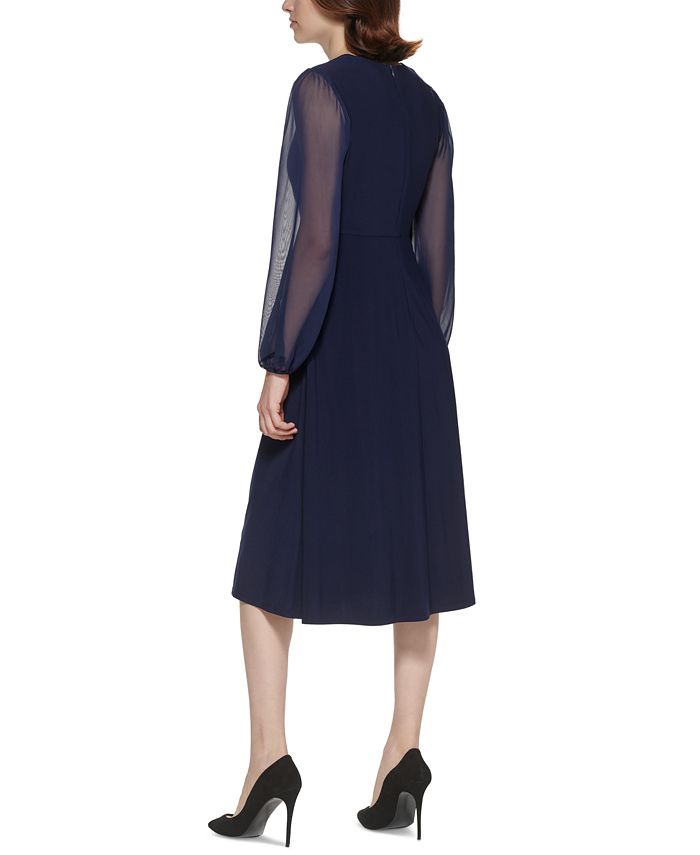 Mangas de chiffon e uma silhueta ampla e elegante criam um vestido midi pequeno e estiloso da Jessica Howard. | Importado | Fecho de zíper nas costas | Forrado | Franzido no busto frontal; bolsos na costura | Mangas bufantes de chiffon | Decote em V; Silhueta em A
