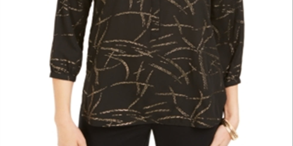 Blusa de noite feminina estampada com manga 3/4 e decote em joia, preta, tamanho pequeno P