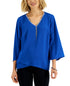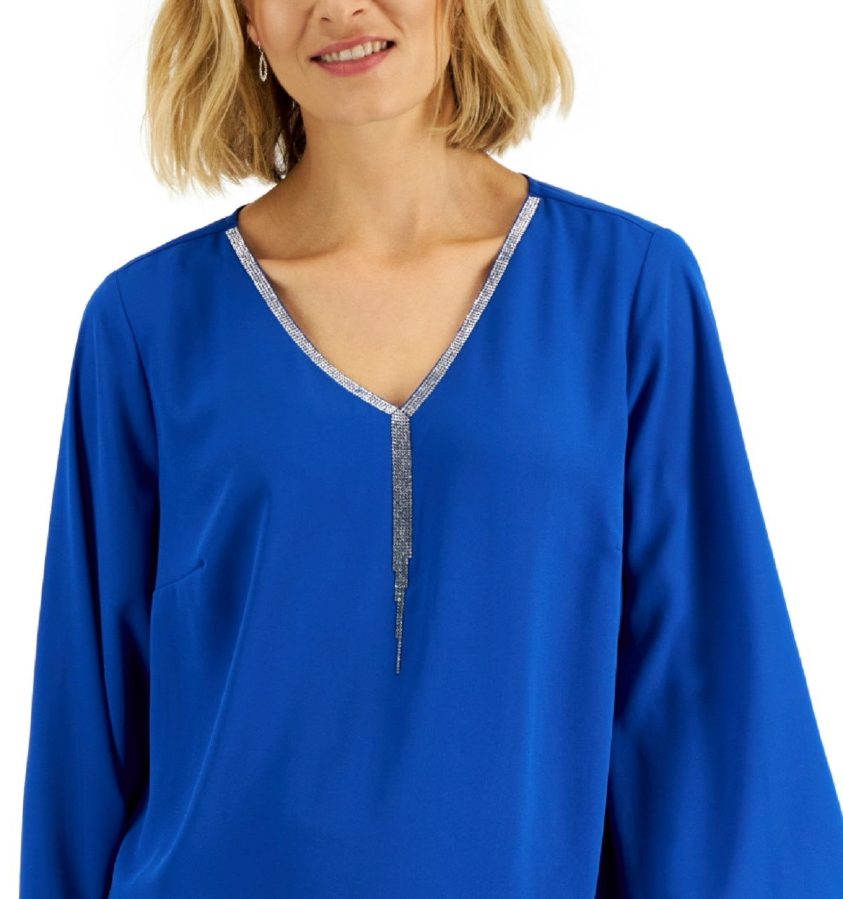 Ask a question about JM Collection Top feminino com decote cruzado e detalhes em azul, tamanho pequeno médio