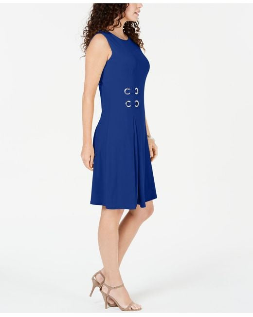 Aproximadamente 36-1/2 de comprimento do centro do pescoço até a bainha | Projetado para se ajustar e valorizar pessoas de 1,62 m ou menos | Decote redondo; silhueta em A | Estilo pulôver | Ilhós na cintura lateral; prega invertida na saia