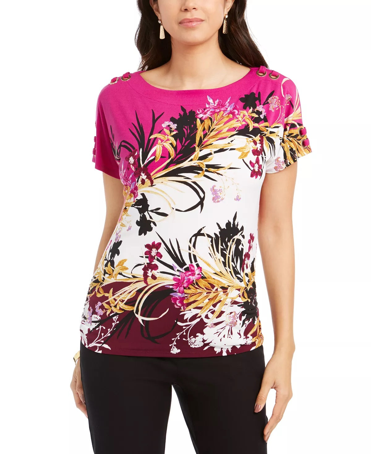 Ask a question about JM Collection Top feminino estampado com cadarço rosa tamanho grande