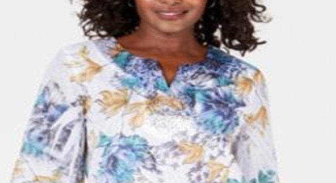 JM Collection Top estampado feminino com tachas, azul, tamanho médio