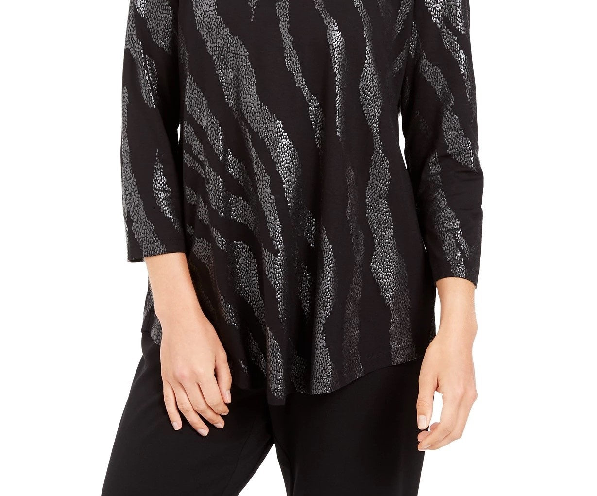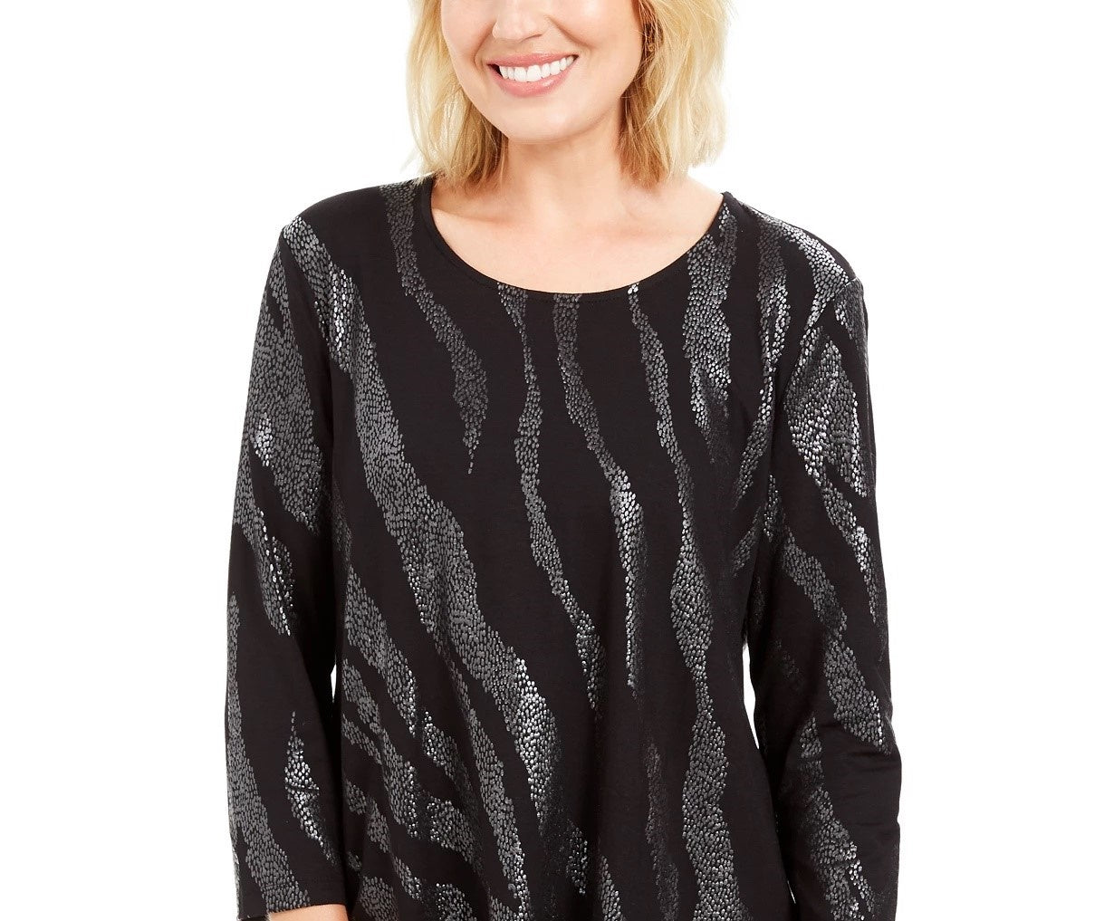 Top estampado com decote redondo da coleção feminina JM, preto, tamanho pequeno