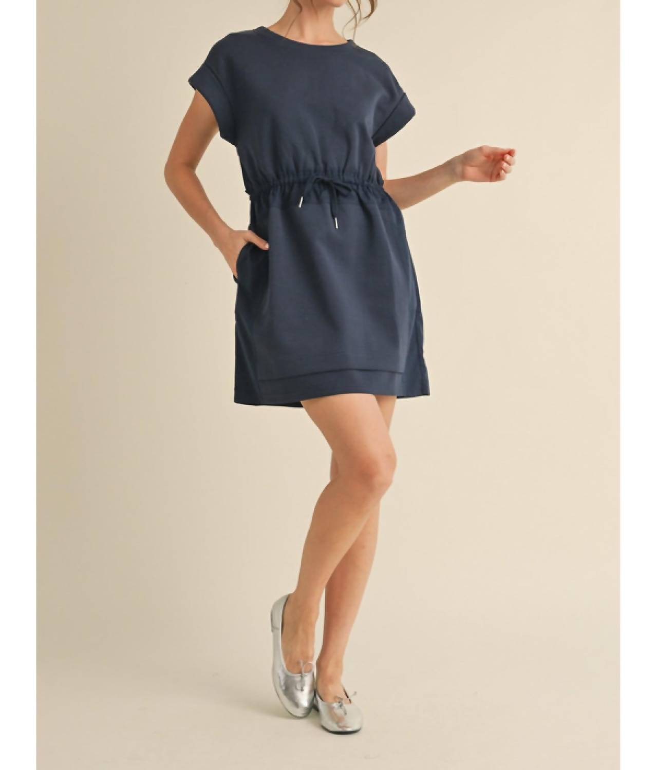 The kind of easy and flattering dress you'll be reaching for all season long. Introducing the Brady Athletic Mini Dress by Jodifl, a chic and comfortable choice for spring wardrobes. With short cuffed cap sleeves, this dress is crafted from a soft, stretchy athleisure material composed of 50% Cotton, 45% Polyester, and 5% Spandex, measuring 35 inches in length. The cinched waist with a drawstring offers a flattering fit, and it features convenient pockets. Closure is a pull-on style, and it requires hand washing for care.