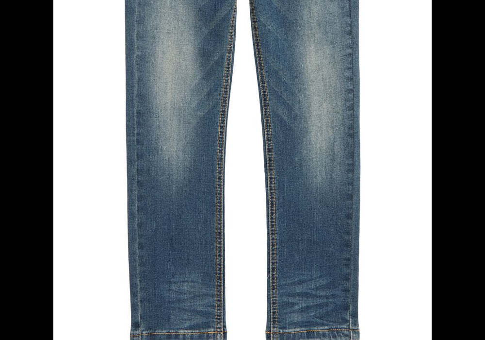 Design de perna reta | Tecido elástico | Cor de enxágue | Tamanho 8 | Material de qualidade premium | Acabamento elegante | Ajuste confortável | Construção durável | Comprimento de costura interno conveniente | Estilo clássico de 5 bolsos