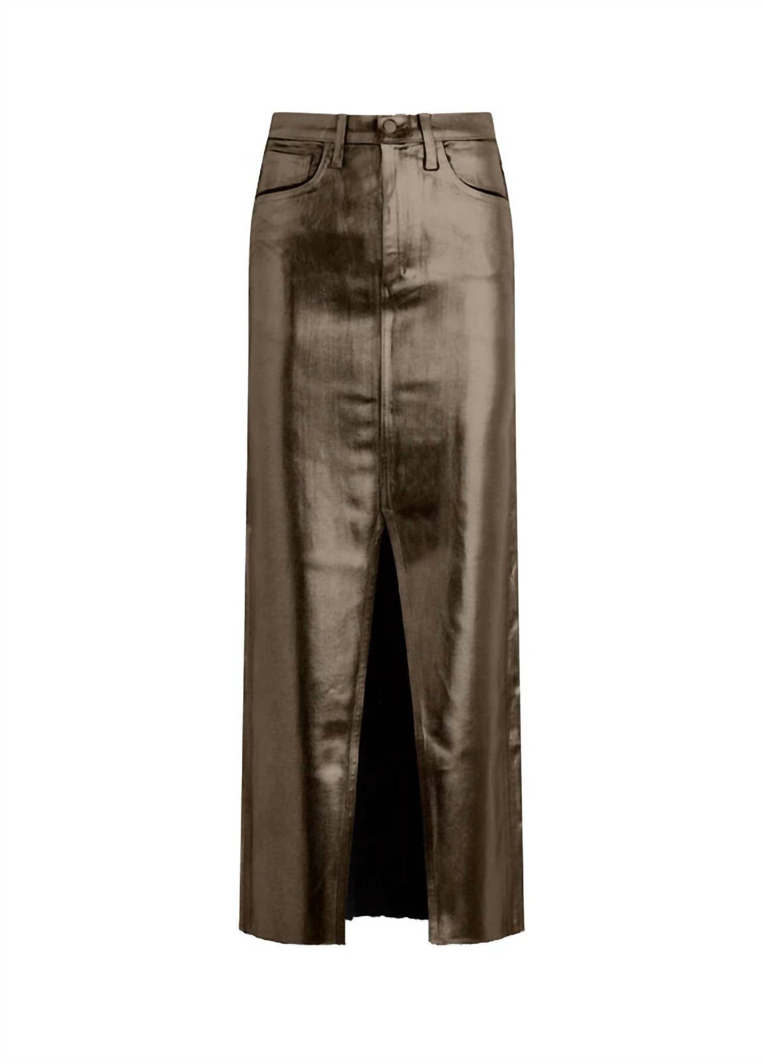 Vista sua camiseta favorita para um visual mais casual, porém feminino. Uma peça requintada em jeans preto Gilded Night com acabamento em prata derretida. Esta saia de cintura alta apresenta um corte em A com fenda central frontal, confeccionada em uma mistura de algodão com 90% algodão, 8% poliéster e 2% elastano. Com fecho de zíper e estilo clássico de 5 bolsos e detalhe na bainha sem acabamento, proporciona um caimento justo e elegante na cintura e nos quadris. Originária da China. Os cuidados com esta peça incluem lavagem à máquina e secagem na horizontal.