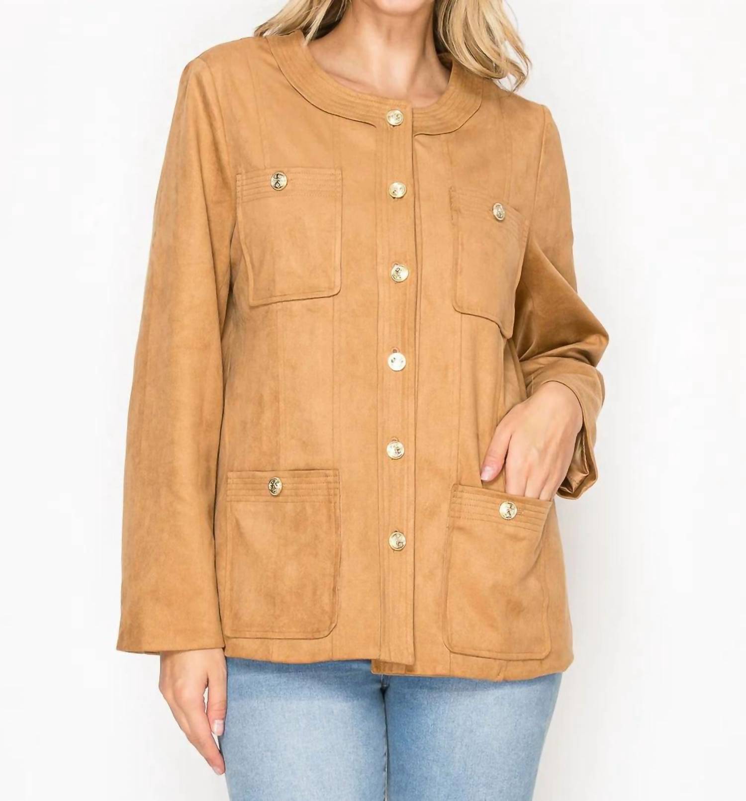 The coolest, most versatile utility jacket. Match it with your favorite pair of denim or throw it over any day dress. Introducing the Jadzia Jacket by Joh, a sophisticated utility jacket in a striking caramel hue that channels classic '90s fashion. Crafted from high-quality suede with a solid pattern, this long-sleeved jacket features structured shoulder pads, four practical front pockets, and eye-catching gold hardware buttons. Composition: 90% Polyester, 10% Spandex, with a full lining of 100% Polyester. Care: Hand wash or dry clean. Made in China. Closure: Button closure. Ideal for a vacation wardrobe, this jacket combines timeless style with modern versatility for the perfect fall look.