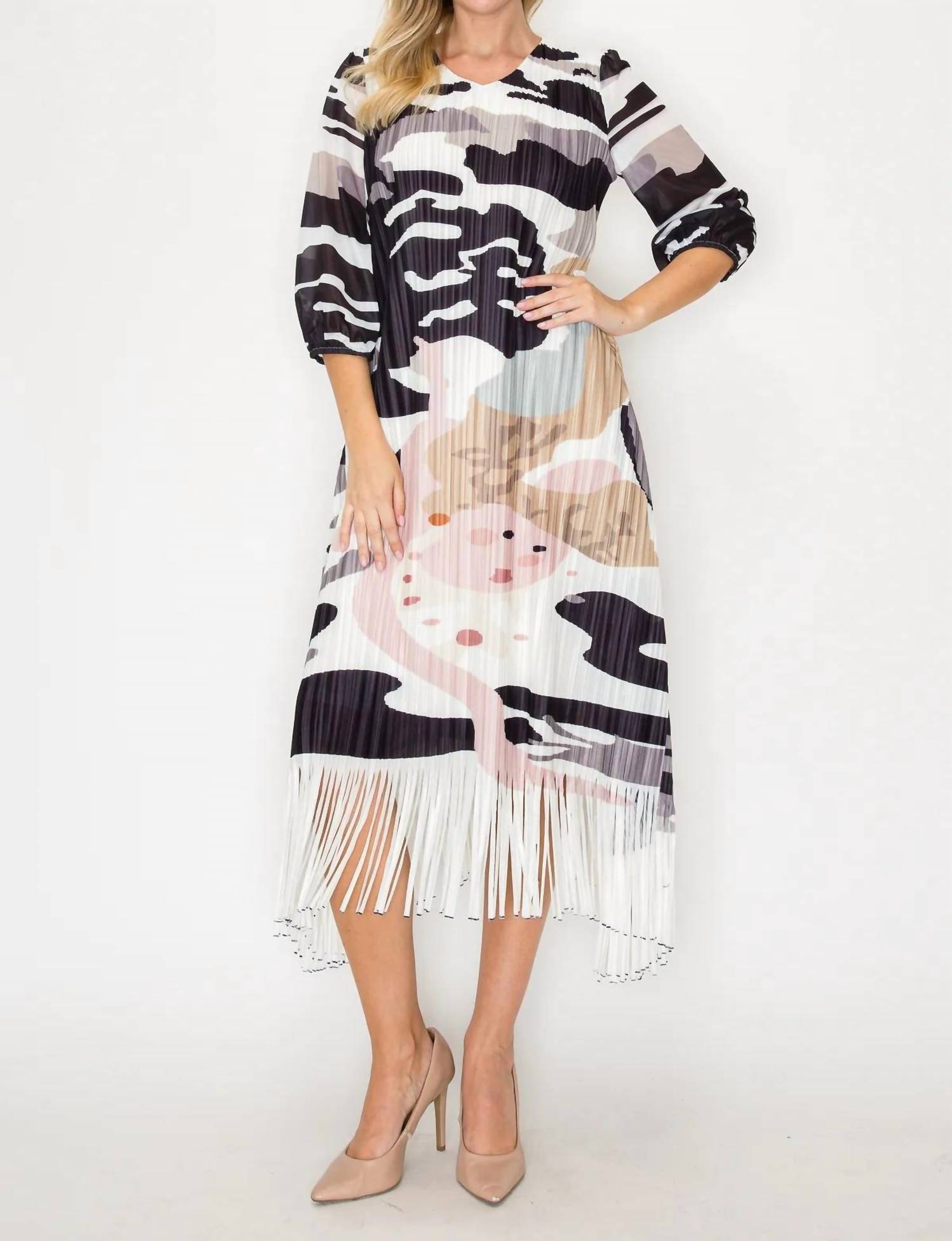 Embrace boho chic style with the Janessa Pleated Fringe Dress by Joh, featuring a colorful multi-pattern that's perfect for vacation and Thanksgiving looks. This midi dress boasts three-quarter sleeves and an A-line silhouette with a trendy V-neck, making it a stylish choice for Spring. Designed without pockets for a streamlined look, this dress can be easily worn with its pull-on closure. Please note specific care instructions are not provided, so handle with care.