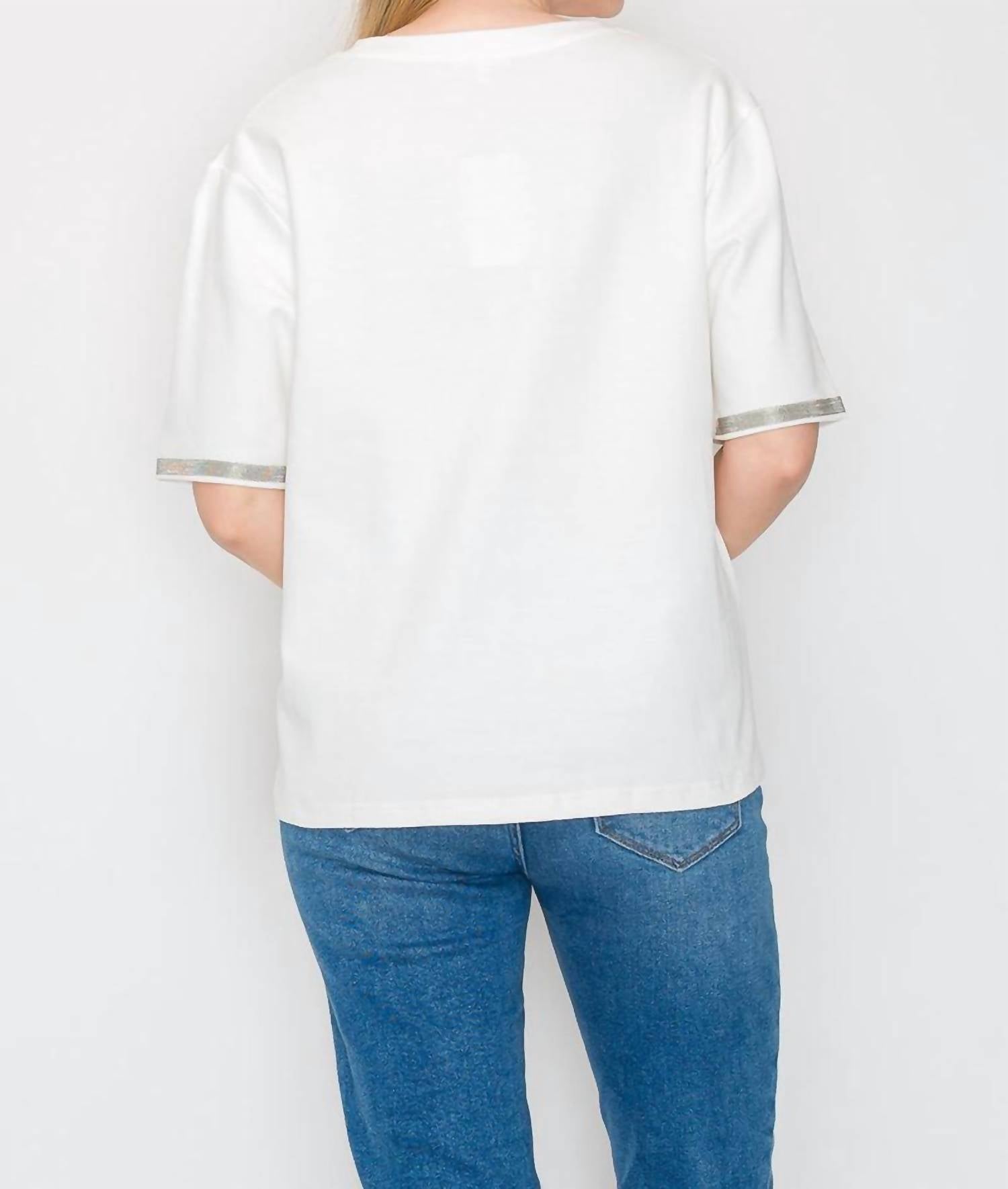 Apresentamos o Top Roxi da JOH, seu novo item essencial no guarda-roupa, em branco clássico. Esta peça possui mangas curtas e gola redonda, confeccionada em malha de ponta elástica de alta qualidade para um caimento relaxado. Adicionando um toque moderno, o top é realçado por detalhes metálicos na frente e na barra das mangas. Fechamento: Design pull-on, ideal para uso diário.