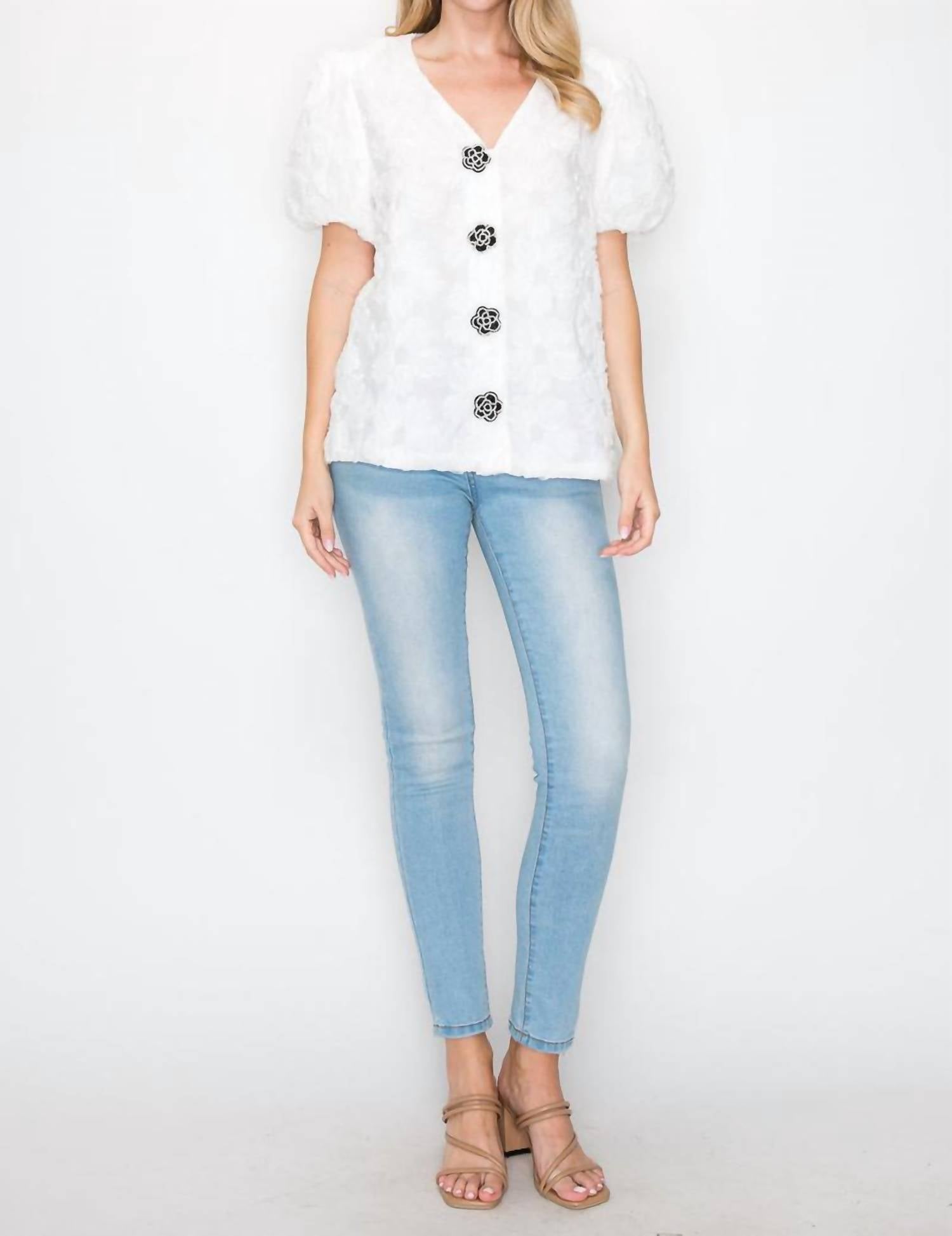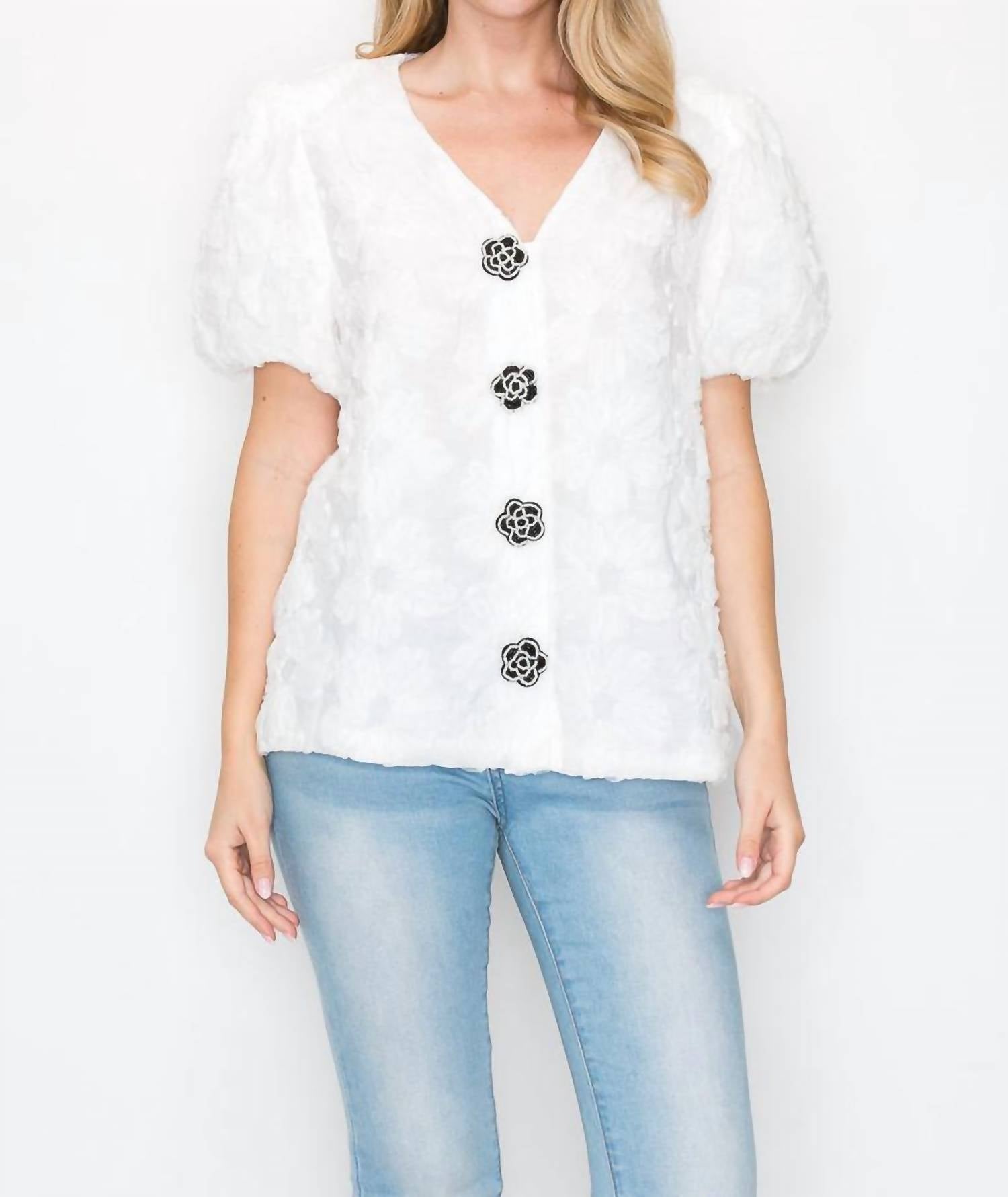 Combine isso com seus jeans e chinelos favoritos para sua próxima noite entre amigas. Conheça o Top Wendy da JOH, uma adição doce e encantadora ao seu guarda-roupa. Confeccionado em branco com renda texturizada, possui decote em V frontal e mangas curtas levemente bufantes para um toque feminino. Esta blusa estilosa apresenta um caimento relaxado com charmosos fechos de botões florais. Abrace a elegância chique com esta peça atemporal.