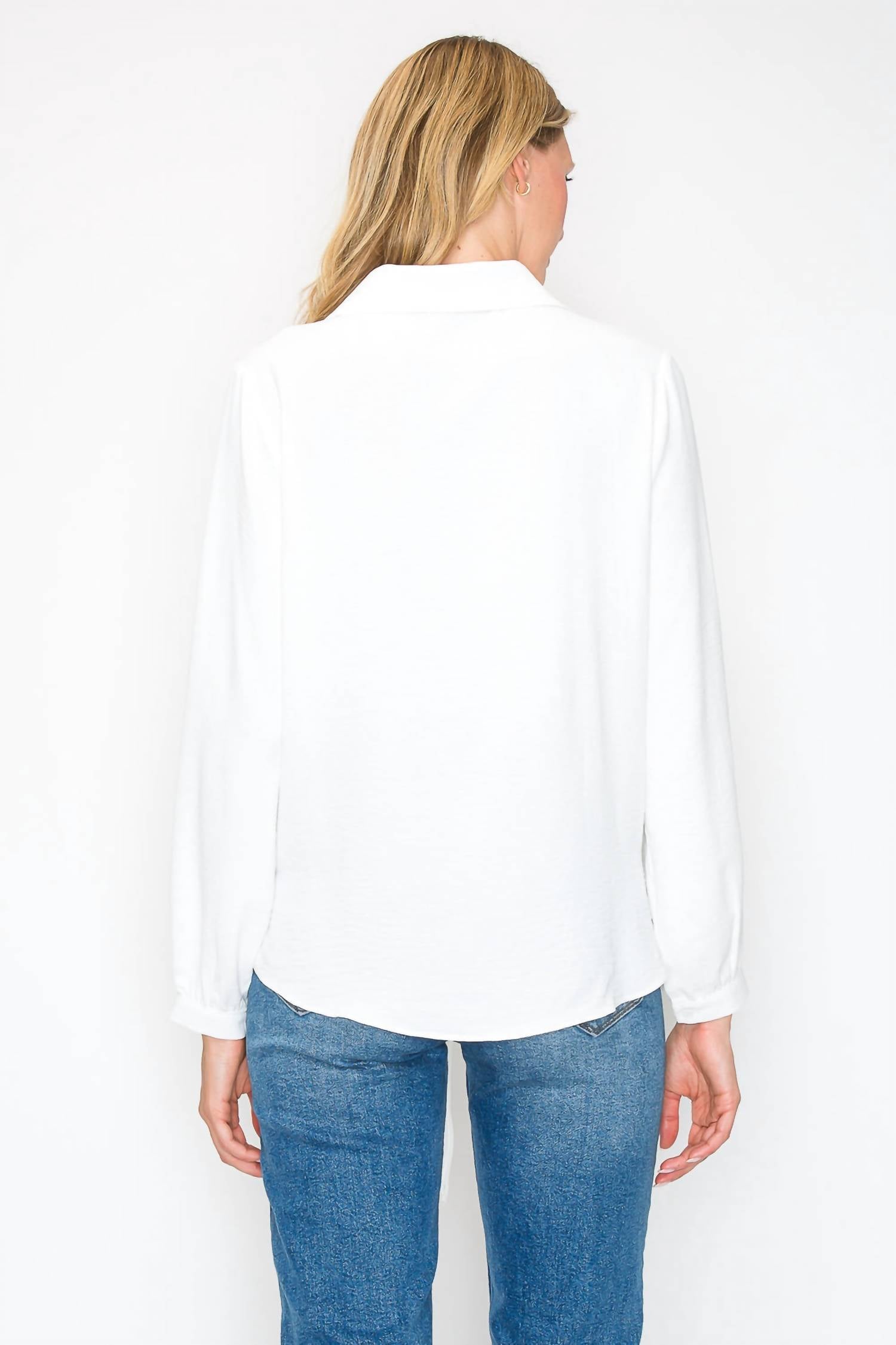 This top is a wardrobe staple that combines casual, timeless, and modern elements. Crafted from high-quality, lightweight, and flowing crepe fabric, it showcases a classic collar, button-down front, long sleeves, and a chic tie-front overlap detail. With its relaxed fit, this versatile piece delivers both comfort and style, ideal for any event or everyday wear.