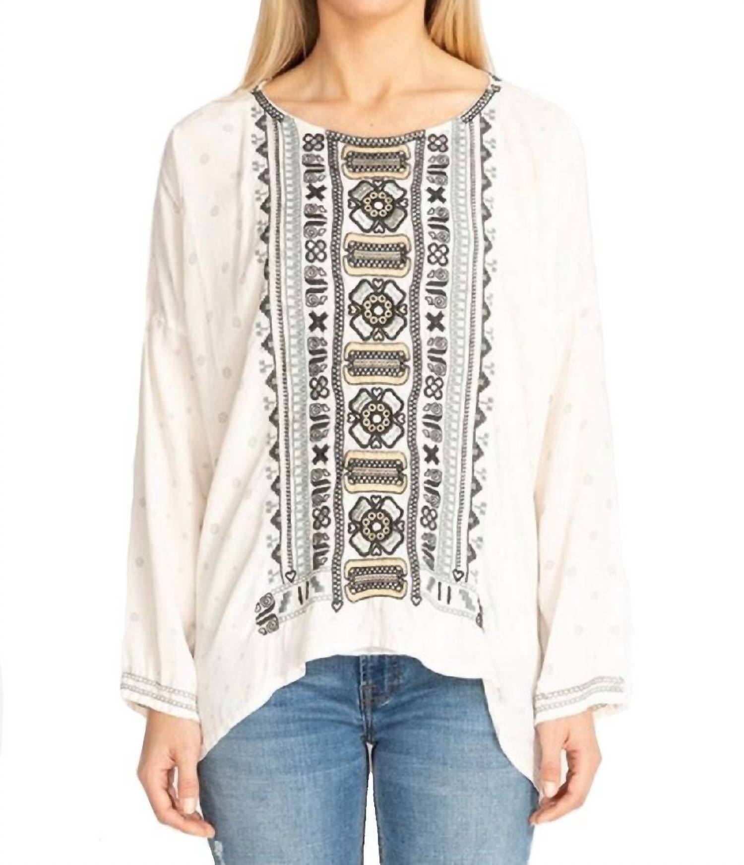 Uma blusa versátil que pode ser usada do escritório ao jantar! Apresenta um design geométrico refinado em uma paleta de cores serenas. Confeccionada em 100% seda luxuosa, esta blusa apresenta um decote canoa e uma silhueta elegante. Decote canoa. Somente lavagem a seco.