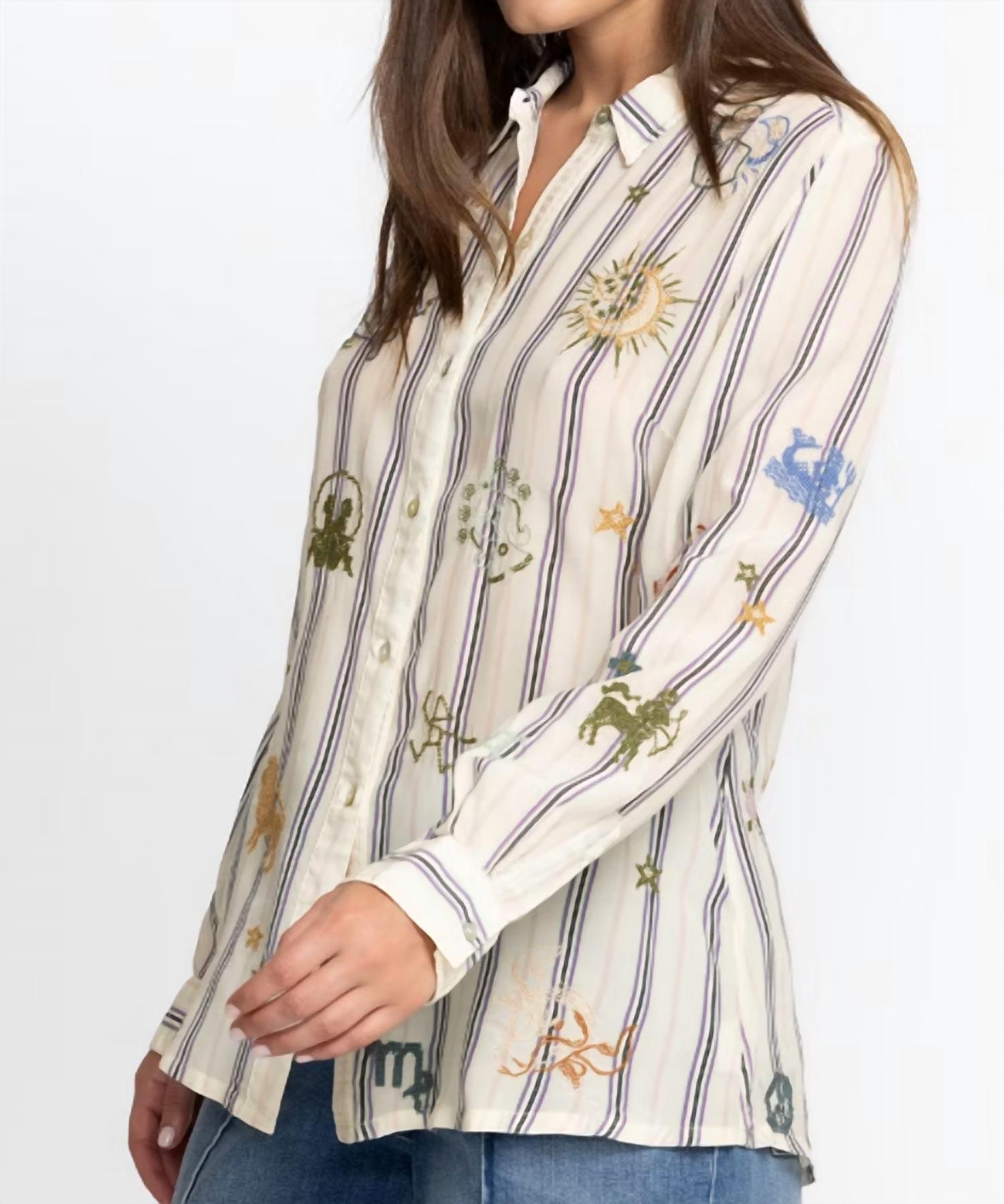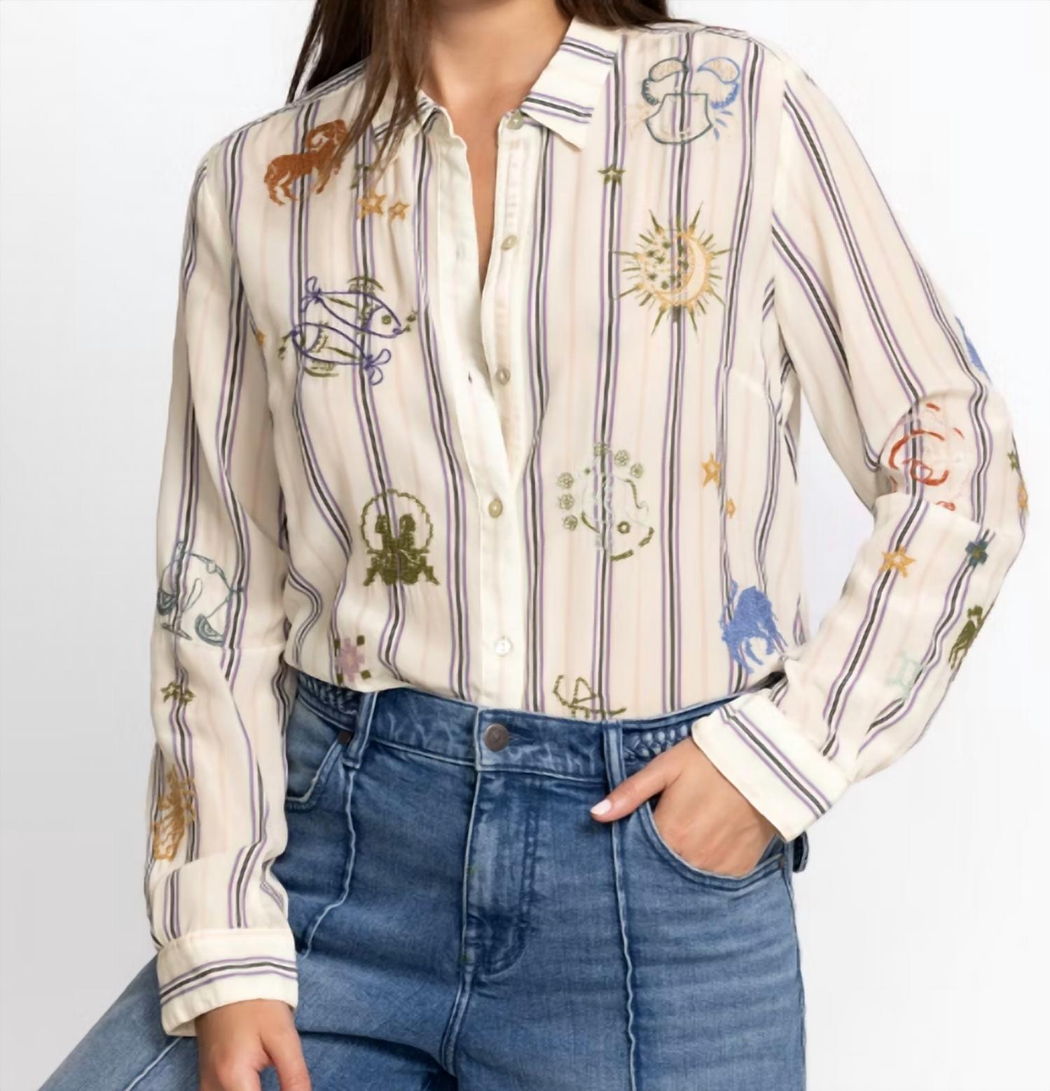 Uma blusa versátil que pode ser usada do escritório ao jantar! Apresentamos a Camisa Ariana com Botões nas Costas da Johnny Was, uma blusa boho chic perfeita para ocasiões de verão, como o Dia de Ação de Graças ou reuniões da igreja. Esta peça marcante apresenta mangas longas e gola alta, confeccionada em seda luxuosa. Estampada com listras elegantes, oferece elegância e conforto. Para um cuidado ideal, lave somente a seco.