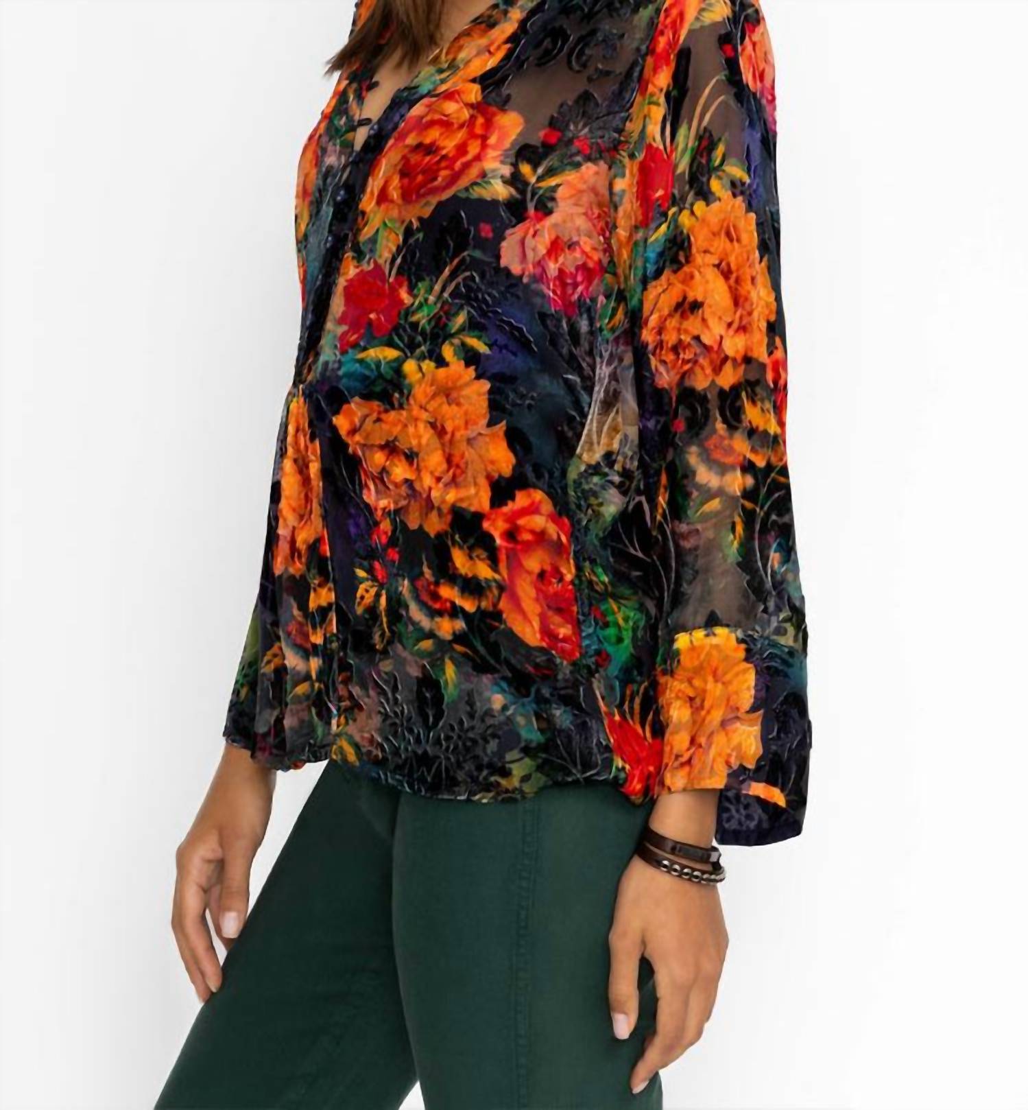 Eleve seu guarda-roupa com a Blusa Johnny Was Botina Burnout, uma peça boho chic deslumbrante com um rico padrão floral azul. Possui mangas compridas e um decote em V charmoso, perfeito para reuniões de verão ou festas de fim de ano como o Dia de Ação de Graças. Confeccionada em viscose luxuoso, esta blusa oferece fecho de botão para facilitar o uso. As instruções de cuidado recomendam lavagem a seco para manter seu visual elegante.