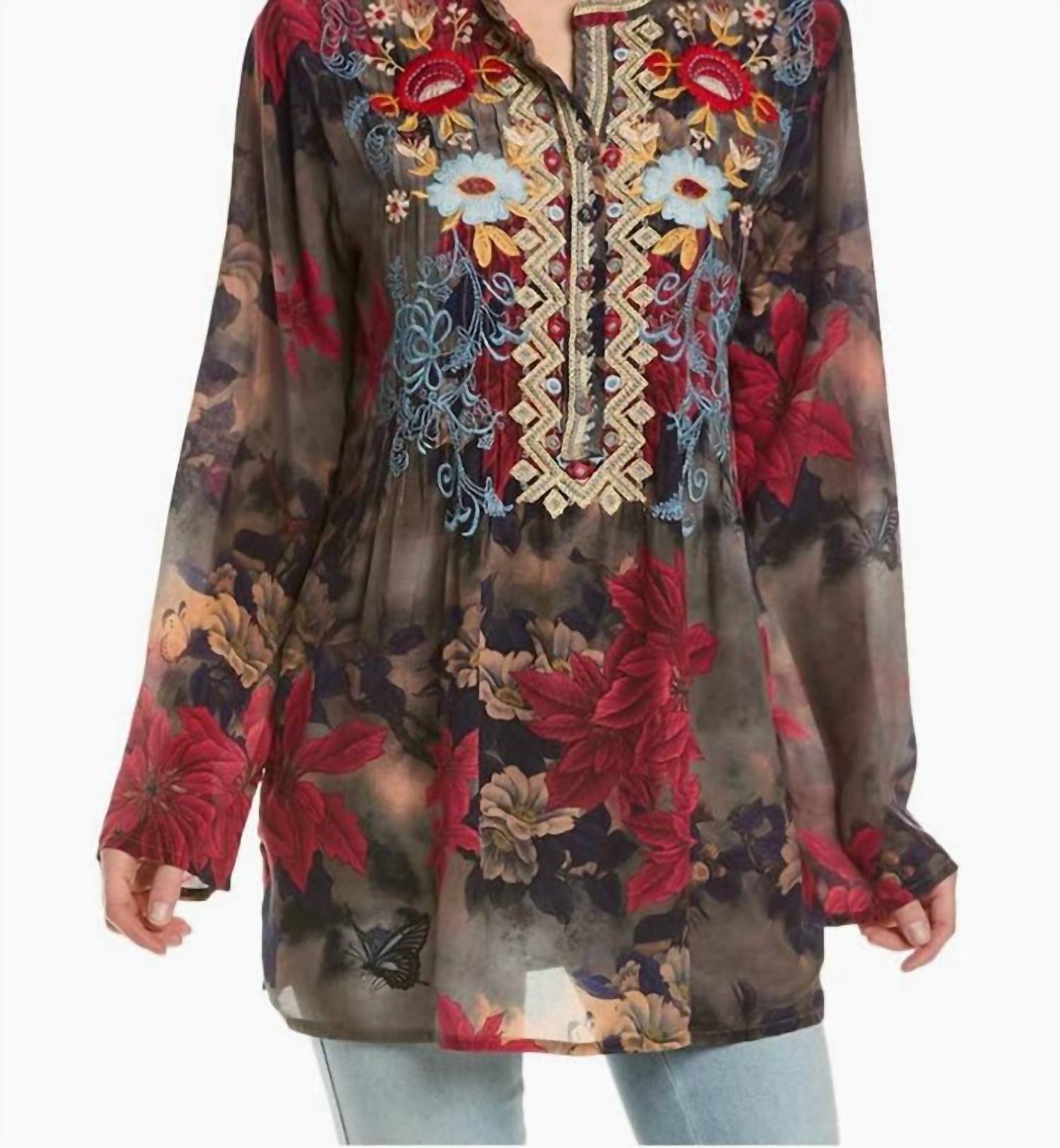 Descubra o charme versátil desta blusa túnica, projetada para ser usada em camadas ou sozinha. Sua silhueta elegante e detalhes elegantes a tornam um item essencial no guarda-roupa. Delicie-se com a Túnica Claret Nephele da Johnny Was, uma peça de destaque com mangas longas em um vibrante padrão multicolorido. Confeccionada em seda luxuosa, esta túnica boho chic exala elegância com seu design de gola alta, perfeita para uma festa de fim de ano ou celebração da Páscoa. O fecho de botão adiciona um toque de sofisticação e praticidade. Para cuidar, basta lavar esta peça requintada à mão para manter sua beleza.
