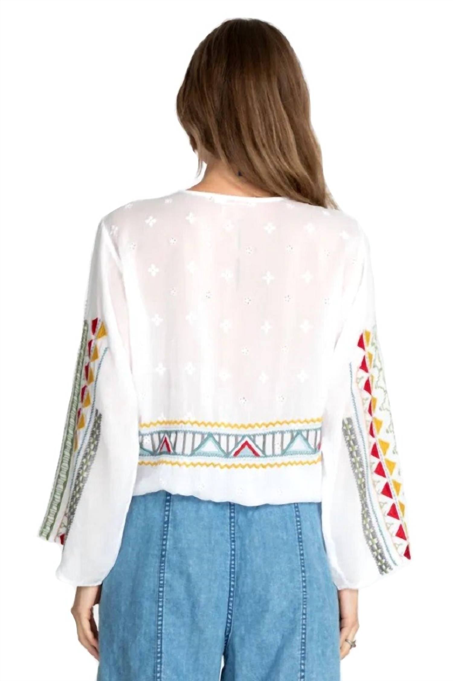 Uma blusa versátil que vai do escritório ao jantar! 100% rayon Bordado Botões na frente Amarração na bainha Medidas para um tamanho médio: Comprimento - 26", Busto - 44 1/2" Este top foi primorosamente projetado para apresentar todos os detalhes, desde bordados deslumbrantes até botões na frente e gravatas artisticamente colocadas na bainha.