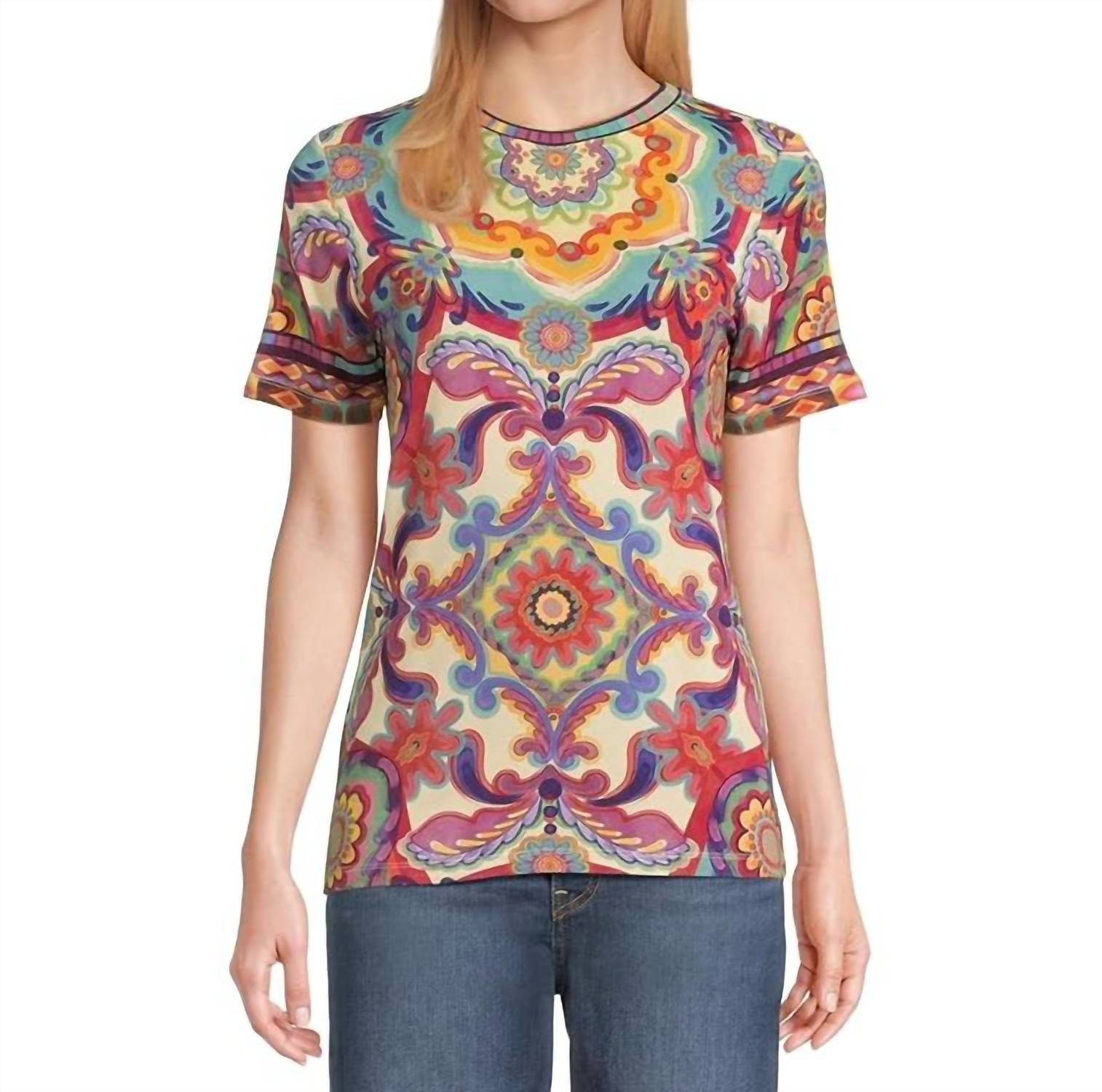Embrace vibrant style with the Janie Favorite Short Sleeve Tee by Johnny Was, featuring a rich Mcanna Scarf pattern that elevates any outfit. This short-sleeve tee is crafted from 95% Rayon and 5% Spandex for comfortable wear and a flattering fit. Closure: Pull-on design. Care: Machine wash cold, tumble dry low, warm iron as needed. Available in a versatile size, with a medium measuring 42" bust and 25.5" front length. Perfect for your next vacation under the summer sun.
