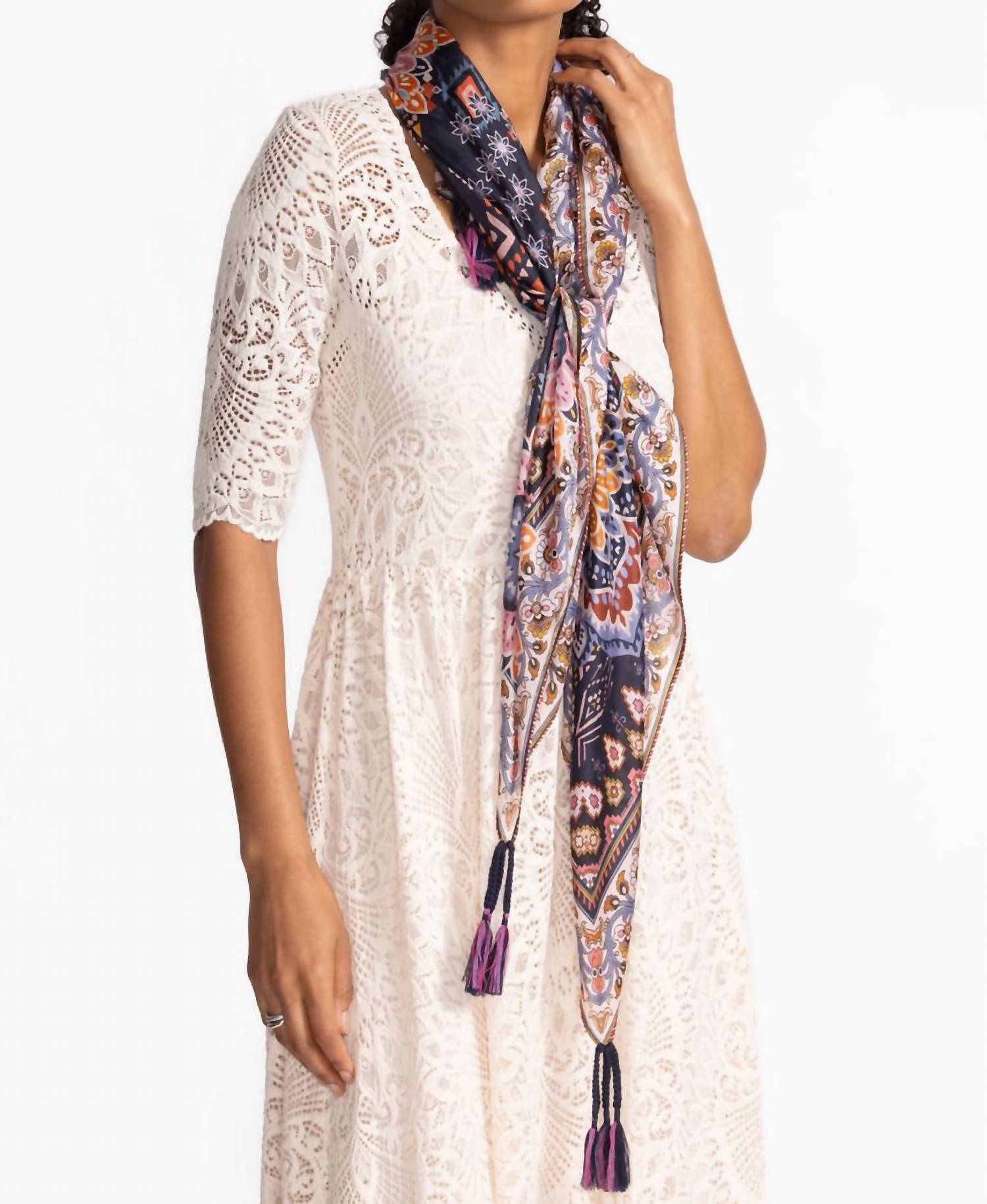 Elevate your style with the Johnny Was Padma Silk Scarf, crafted from luxurious 100% silk. With measurements of 44" x 44", this beautifully designed scarf features a retro-inspired pattern and a kaleidoscope of colors. The square shape is finished with tassels at each corner, adding texture and versatility to your look. Care for this delicate piece by hand washing in cold water and hanging it to dry; avoid bleach and ironing.