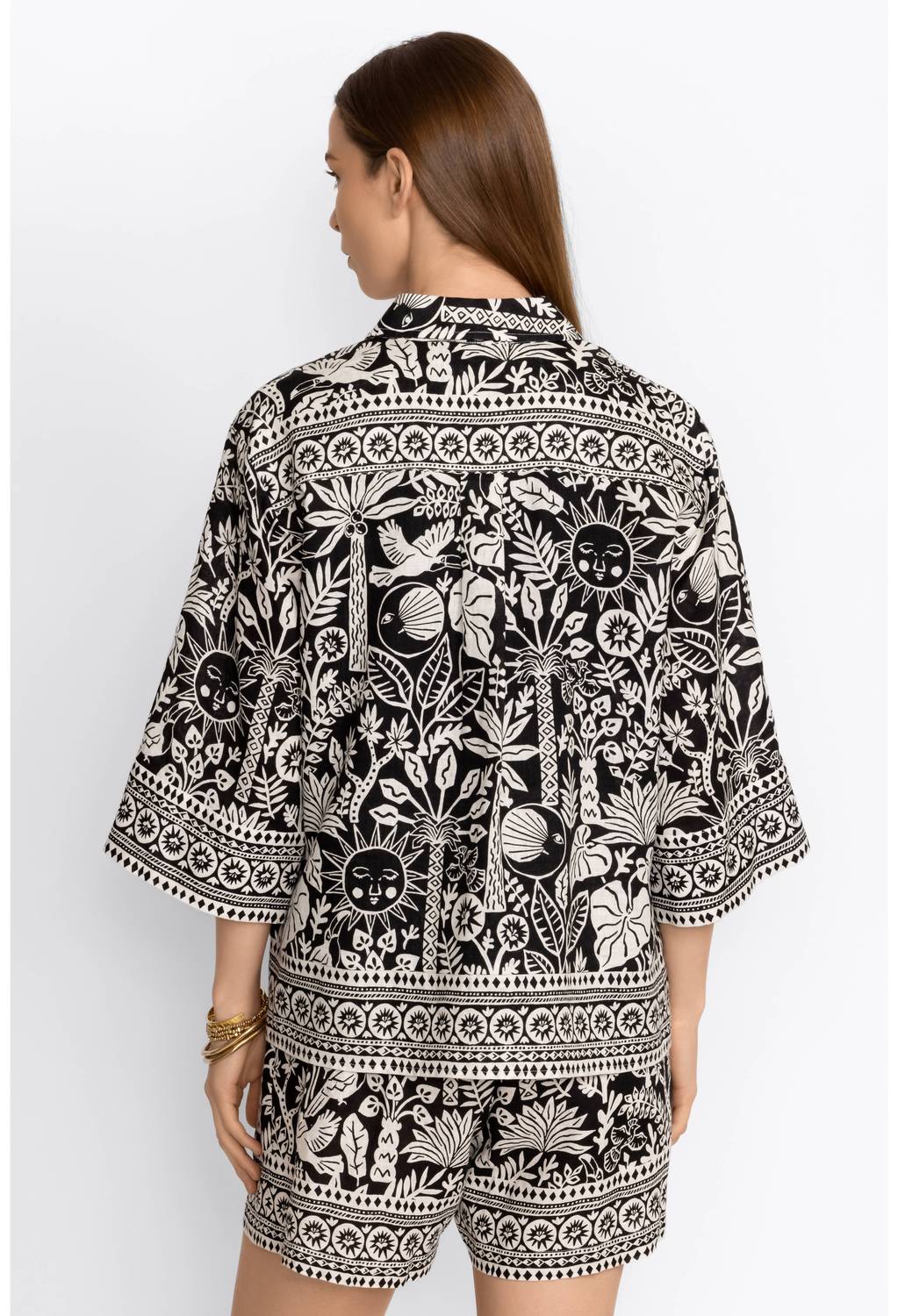 Descubra a Camisa com Manga Kimono Lucianna da Johnny Was, uma peça marcante confeccionada em 100% linho para máxima respirabilidade. Esta blusa de caimento relaxado, em elegantes tons de preto e branco, apresenta mangas kimono três quartos e uma gola tradicional com botões na frente. O design com estampas intrincadas adiciona um toque boho chique, perfeito para um look de férias. Cuide desta peça deslumbrante lavando-a na máquina com água fria e secando em temperatura baixa; as medidas para o tamanho médio incluem um comprimento frontal de 66 cm e um busto de 114 cm.