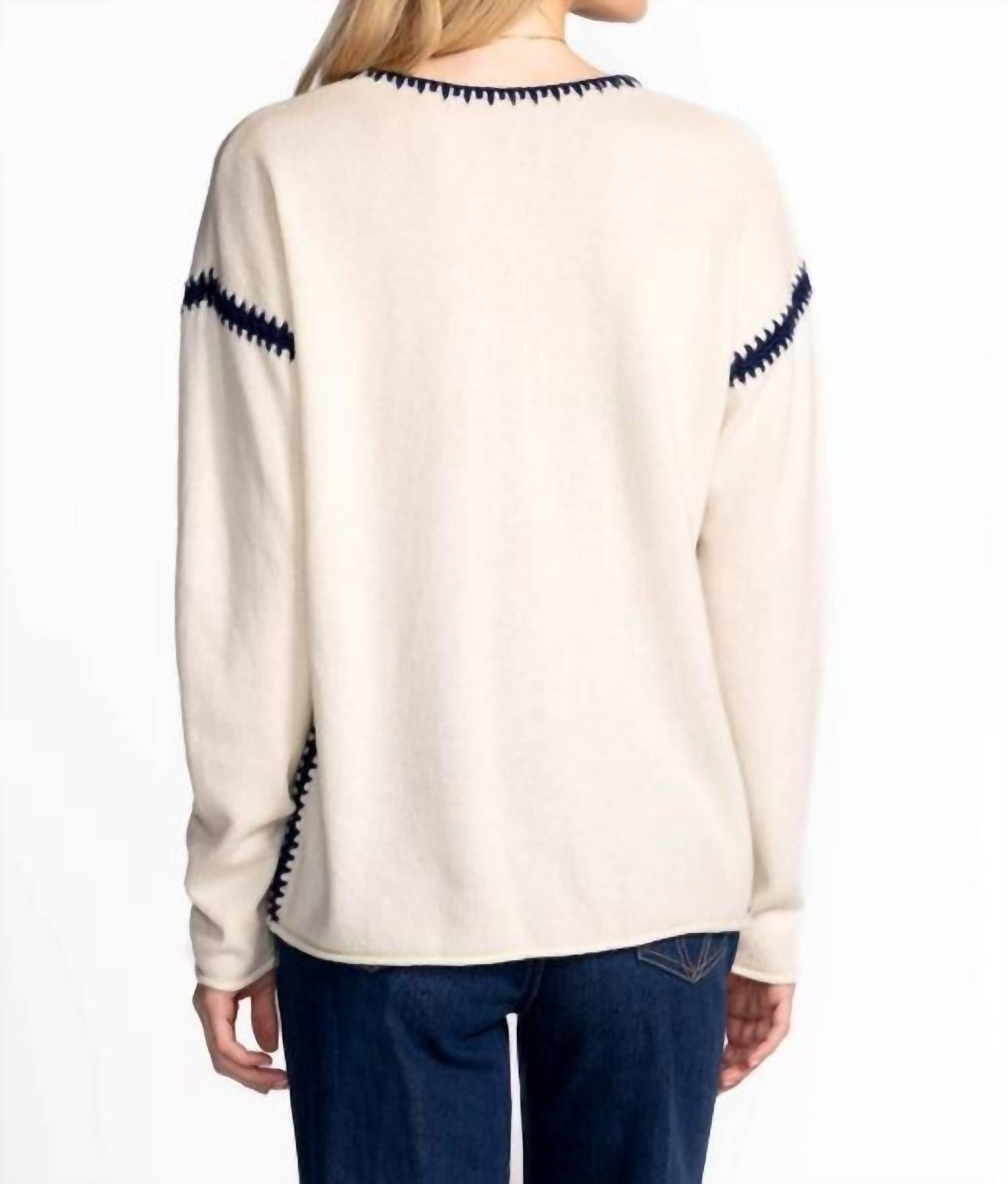 The Whipstitch V-Neck Pullover is both cozy and stylish. Made from a luxurious blend of wool and cashmere, it features a V-neckline and a drop-shoulder design. The contrast whipstitch and embroidered details provide a refined touch. Pair it with relaxed-fit jeans and fashion sneakers for a polished casual look.
