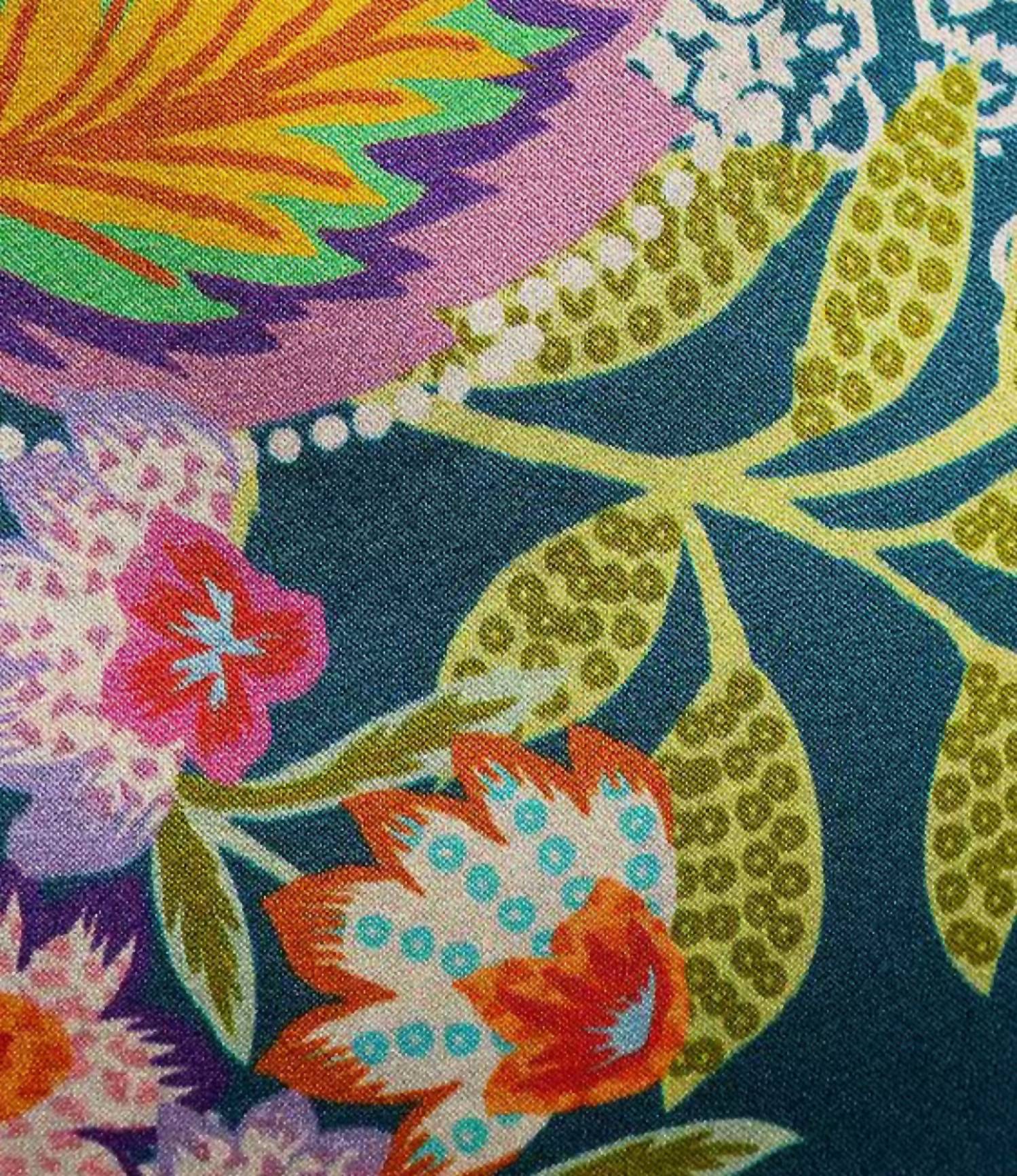 Luxuosa confecção em seda trançada. Gola mandarim, mangas compridas com punhos abotoados, estampa vibrante de flora e fauna, bainha reta, fecho frontal central com botões revestidos em tecido. Comprimento aproximado de 66 cm, tamanho real. Lavagem à mão. 100% seda.